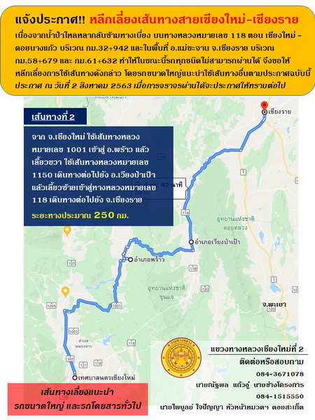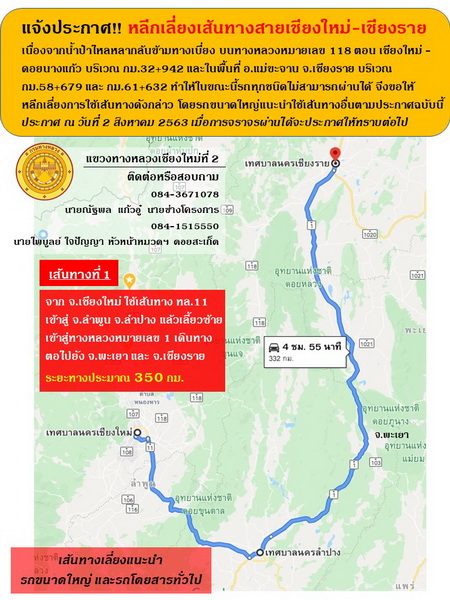 ทั้งนี้ ขอประชาสัมพันธ์ในการใช้เส้นทาง เพื่อการเดินทางจาก เชียงใหม่ ไปพะเยา และเชียงราย ดังนี้.-