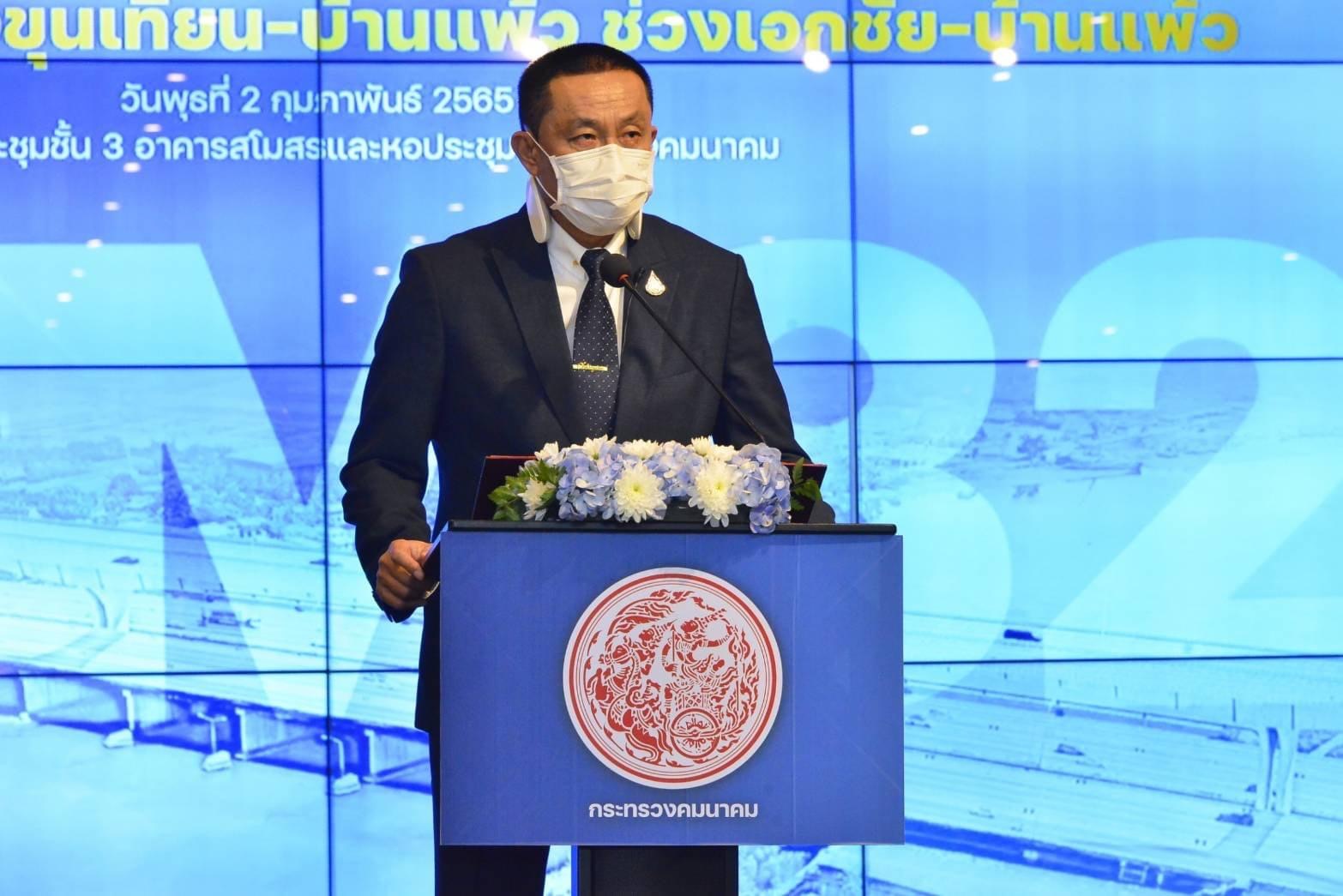 นายศักดิ์สยาม ชิดชอบ รัฐมนตรีว่าการกระทรวงคมนาคม กล่าวว่า ถนนพระราม 2 เป็นเส้นทางหลักเชื่อมสู่ภาคใต้ของประเทศ มีปัญหาจราจรติดขัดจนเป็นอุปสรรคต่อการเดินทางมาโดยตลอด พลเอก ประยุทธ์ จันทร์โอชา นายกรัฐมนตรี จึงมีนโยบายให้กระทรวงคมนาคมเร่งแก้ไขปัญหาให้ลุล่วงโดยเร็ว โดยเมื่อวันที่ 9 กุมภาพันธ์ 2564 คณะรัฐมนตรีได้มีมติอนุมัติให้ดำเนินการก่อสร้างโครงการทางหลวงพิเศษหมายเลข 82 สายทางยกระดับบางขุนเทียน - บ้านแพ้ว ช่วงเอกชัย - บ้านแพ้ว โดยให้กรมทางหลวง (ทล.) ใช้เงินทุนค่าธรรมเนียมผ่านทางมาดำเนินการในส่วนของงานโยธา กระทรวงฯ จึงได้สั่งการให้ ทล. เร่งดำเนินการหาผู้รับจ้างก่อสร้าง โดยการแก้ปัญหาจะต้องดำเนินการบนถนนพระราม 2 ตลอดแนวเส้นทาง และเชื่อมต่อเข้ากับโครงข่ายทางพิเศษ (การทางพิเศษแห่งประเทศไทย) ทางหลวงพิเศษ และทางหลวงแผ่นดิน (กรมทางหลวง) รวมระยะทาง 90.8 กิโลเมตร ประกอบด้วย 1) โครงการทางพิเศษ สายพระราม 3 - ดาวคะนอง - วงแหวนรอบนอกกรุงเทพมหานคร ด้านตะวันตก ระยะทาง 18.7 กิโลเมตร 2) โครงการก่อสร้างทางยกระดับบนทางหลวงหมายเลข 35 สายธนบุรี - ปากท่อ ช่วงบางขุนเทียน - เอกชัย ระยะทางรวม 8.3 กิโลเมตร ปัจจุบันอยู่ระหว่างการก่อสร้าง ขณะนี้การก่อสร้างมีความก้าวหน้าแล้วร้อยละ 57 3) โครงการก่อสร้างทางหลวงพิเศษหมายเลข 82 ช่วงเอกชัย - บ้านแพ้ว ระยะทาง16.4 กิโลเมตร ซึ่งเป็นโครงการที่มีพิธีการลงนามสัญญาก่อสร้างงานโยธา ในวันนี้ (2 กุมภาพันธ์ 2565) และ 4) โครงการทางหลวงพิเศษหมายเลข 82 ช่วงบ้านแพ้ว - ปากท่อ ระยะทาง 47.4 กิโลเมตร สิ้นสุดที่แยกวังมะนาว อำเภอปากท่อ จังหวัดราชบุรี ซึ่งเป็นโครงการที่มีแผนก่อสร้างในอีก 5 ปีข้างหน้า (พ.ศ. 2570) โดยกระทรวงฯ คาดว่าโครงการนี้จะเป็นอีกหนึ่งทางเลือกในการคมนาคมขนส่งจากกรุงเทพฯ สู่ภาคใต้ และช่วยแก้ปัญหาการจราจรบนถนนพระราม 2 ได้อย่างยั่งยืนต่อไป