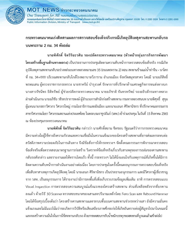 กระทรวงคมนาคมเร่งติดตามผลการตรวจสอบข้อเท็จจริงกรณีเกิดอุบัติเหตุคานสะพานกลับรถ บนถนนพระราม 2 กม. 34 พังถล่ม