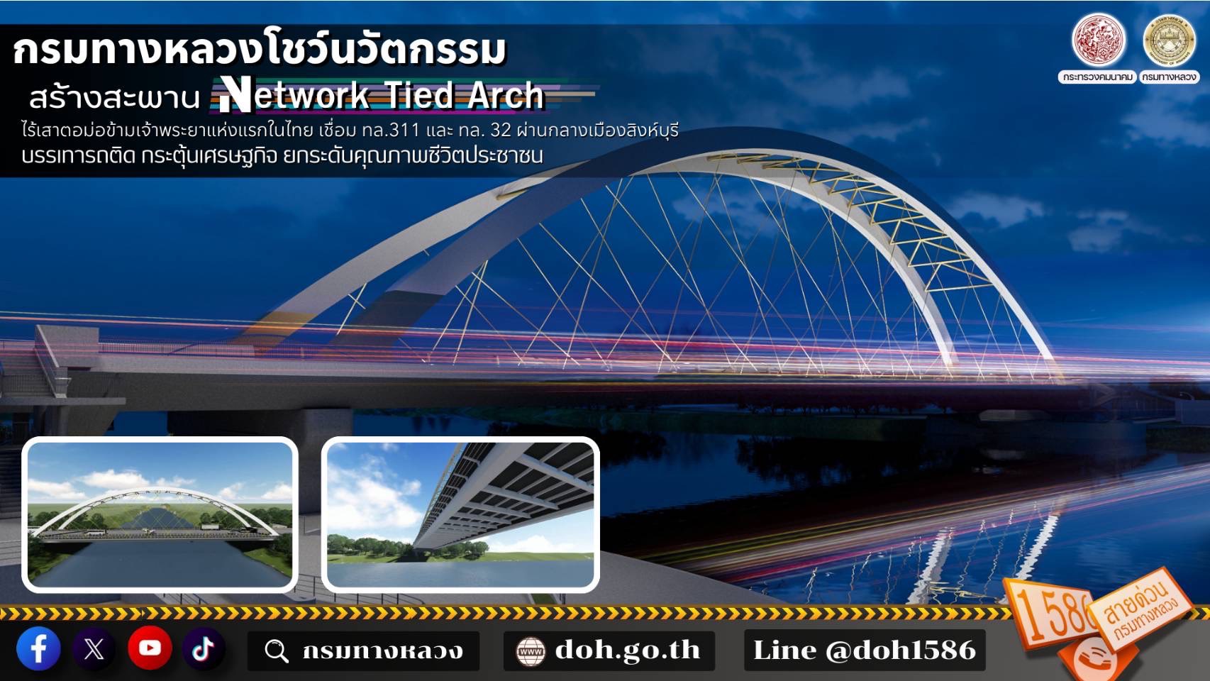 กรมทางหลวงโชว์นวัตกรรม! สร้างสะพาน Network Tied Arch ไร้เสาตอม่อข้ามเจ้าพระยาแห่งแรกในไทย เชื่อม ทล.311 และ ทล. 32 ผ่านกลางเมืองสิงห์บุรี บรรเทารถติด กระตุ้นเศรษฐกิจ ยกระดับคุณภาพชีวิตประชาชน