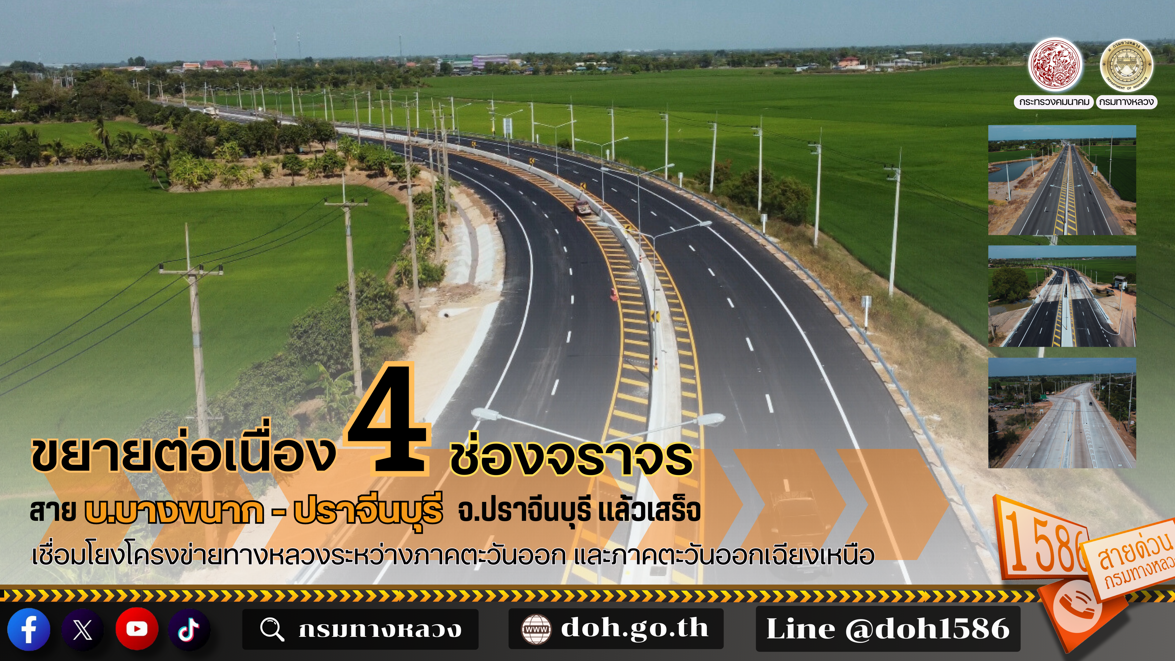 ขยายต่อเนื่อง 4 ช่องจราจร สาย บ.บางขนาก - ปราจีนบุรี จ.ปราจีนบุรี แล้วเสร็จ เชื่อมโยงโครงข่ายทางหลวงระหว่างภาคตะวันออก และภาคตะวันออกเฉียงเหนือ