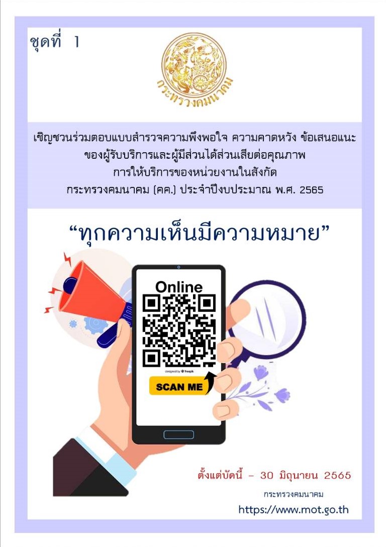 เชิญชวนร่วมตอบแบบสำรวจความพึงพอใจ ความคาดหวังและข้อเสนอแนะของผู้รับบริการและผู้มีส่วนได้ส่วนเสียต่อคุณภาพการให้บริการของหน่วยงานในสังกัดกระทรวงคมนาคม(คค.) ประจำปีงบประมาณ พ.ศ. 2565(ชุดที่1)