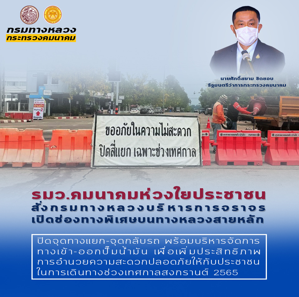 รมว.คมนาคมห่วงใยประชาชนสั่งกรมทางหลวงบริหารการจราจรเปิดช่องทางพิเศษบนทางหลวงสายหลัก ปิดจุดทางแยก-จุดกลับรถ-บริหารจัดการทางเข้า-ออกปั๊มน้ำมัน เพื่อเพิ่ม ประสิทธิภาพการอำนวยการอำนวยความสะดวกปลอดภัยให้กับประชาชนในการเดินทางช่วงเทศกาลสงกรานต์ 2565