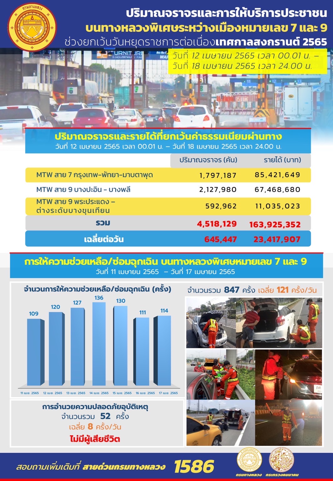 กรมทางหลวง สรุปการให้บริการประชาชนช่วงเทศกาลสงกรานต์ 2565 ยอดจำนวนรถเดินทางกว่า 6.8 ล้านคัน ไม่มีผู้เสียชีวิตบนมอเตอร์เวย์