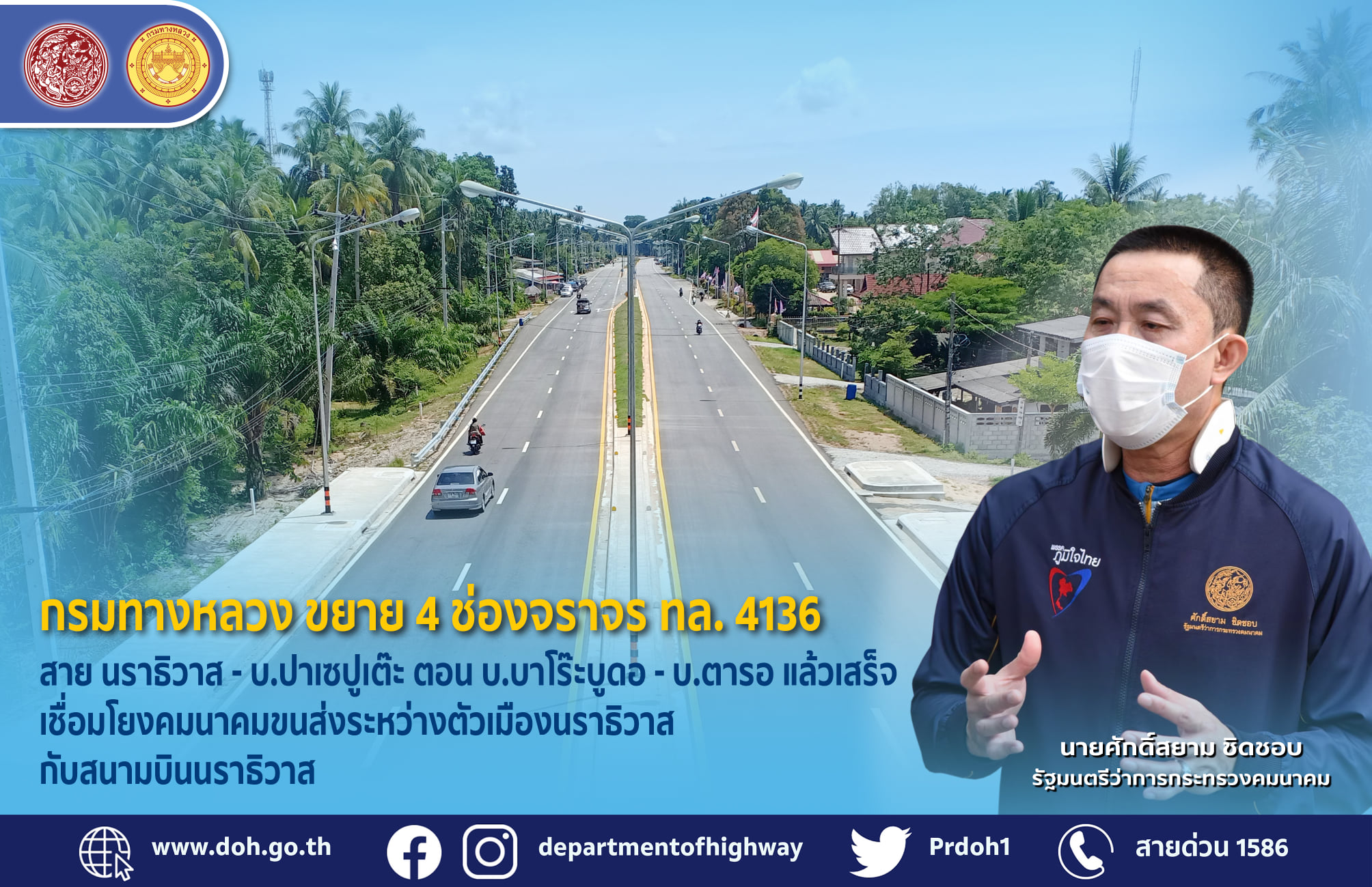 กรมทางหลวง ขยาย 4 ช่องจราจร ทางหลวงหมายเลย 4136 สาย นราธิวาส - บ.ปาเซปูเต๊ะ ตอน บ.บาโร๊ะบูดอ - บ.ตารอ แล้วเสร็จ เชื่อมโยงคมนาคมขนส่งระหว่างตัวเมืองนราธิวาสกับสนามบินนราธิวาส