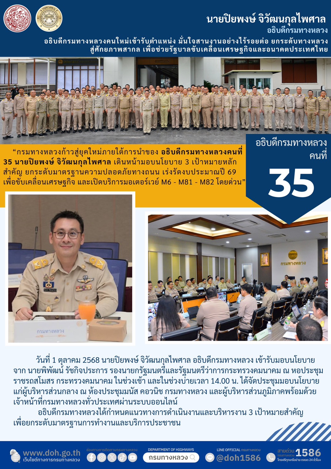 อธิบดีกรมทางคนใหม่เข้ารับตำแหน่ง มั่นใจสานงานอย่างไร้รอยต่อ ยกระดับทางหลวงสู่ศักยภาพสากล เพื่อช่วยรัฐบาลขับเคลื่อนเศรษฐกิจและอนาคตประเทศไทย