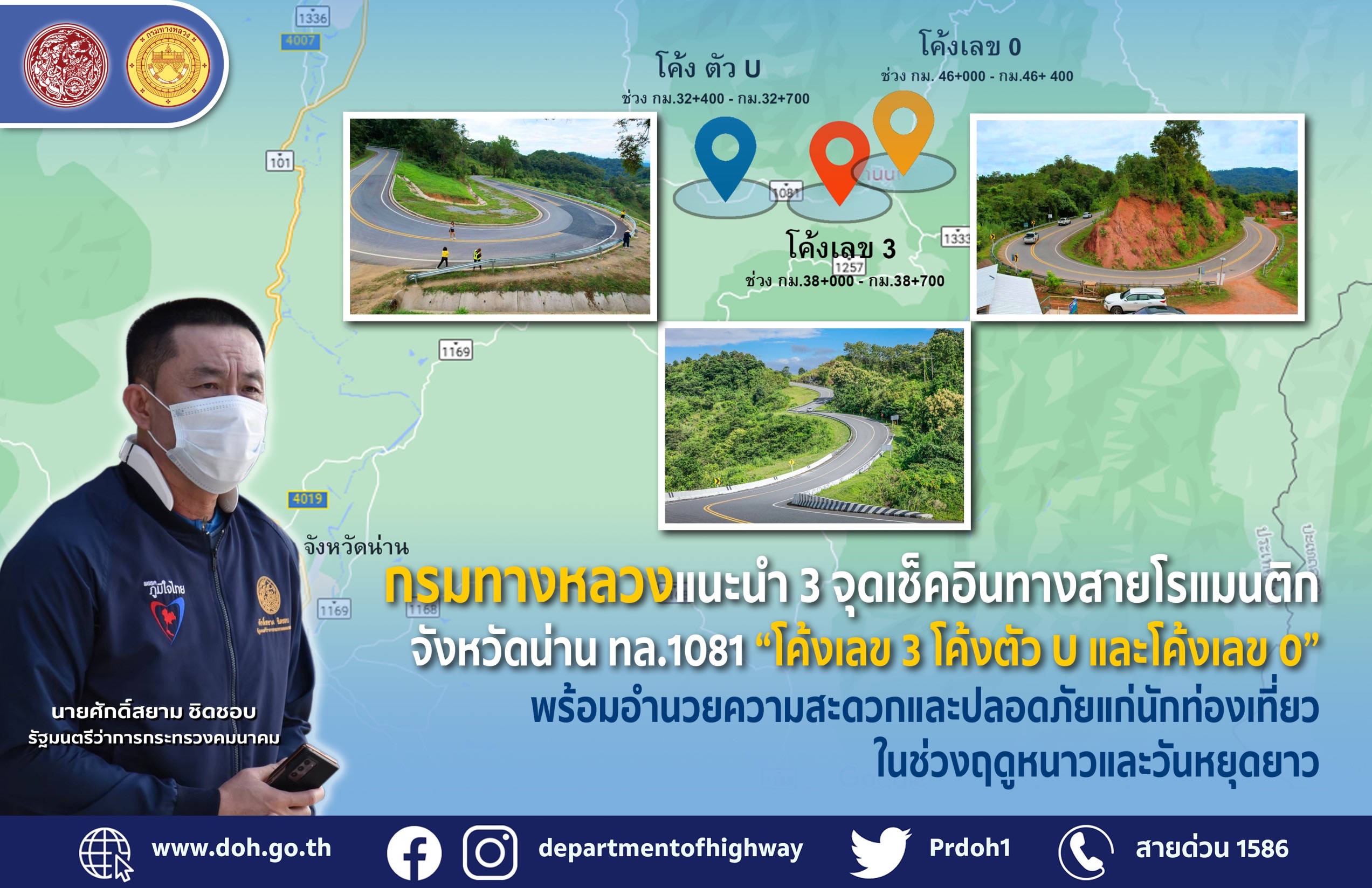 กรมทางหลวง แนะนำ 3 จุดเช็คอินทางสายโรแมนติก ทางหลวงหมายเลข 1081 จังหวัดน่าน “โค้งเลข 3 โค้งตัว U และโค้งเลข 0” พร้อมอำนวยความสะดวกและปลอดภัยแก่นักท่องเที่ยวในช่วงฤดูหนาวและวันหยุดยาว