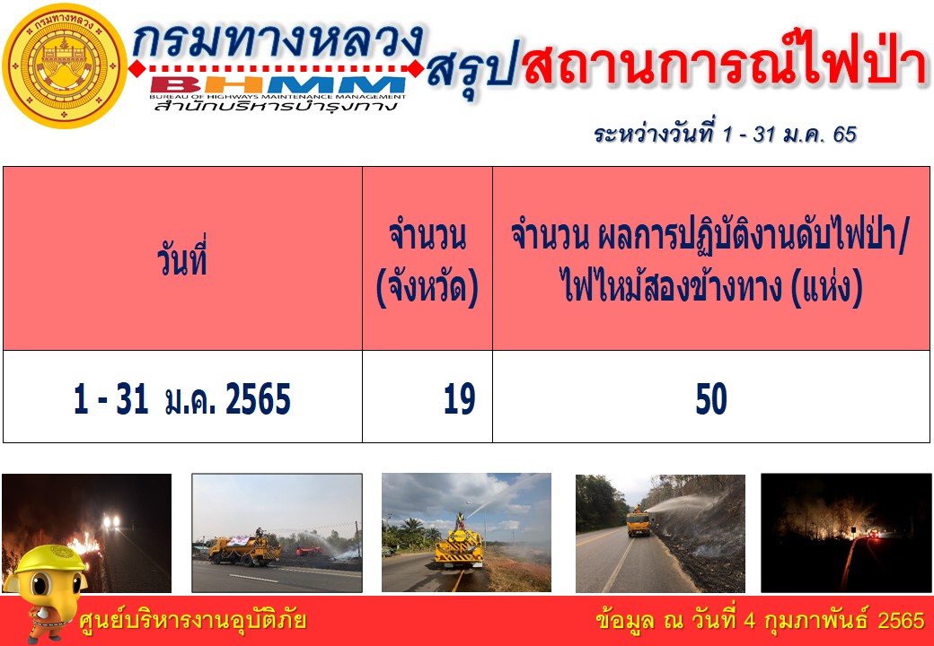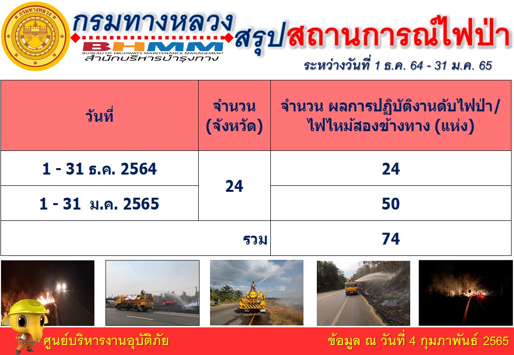 โดยในช่วงระหว่างวันที่ 1 มกราคม - 31 ธันวาคม 2564 กรมทางหลวงได้ดำเนินการปฏิบัติงานดับไฟป่า/ไฟไหม้สองข้างทาง 19 จังหวัด 24 แห่ง และระหว่างวันที่ 1 มกราคม –จนถึงปัจจุบัน (4 กุมภาพันธ์ 2564) ได้ดำเนินการปฏิบัติงานดับไฟป่า/ไฟไหม้สองข้างทาง 19 จังหวัด 64 แห่ง