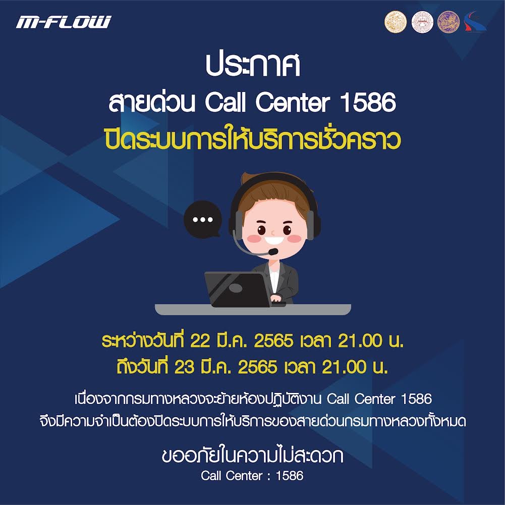 เนื่องจากกรมทางหลวงจะย้ายห้องปฏิบัติงาน Call Center 1586 จึงมีความจำเป็นต้องปิดระบบการให้บริการของสายด่วนกรมทางหลวงทั้งหมด ตามวันและเวลา ดังกล่าว