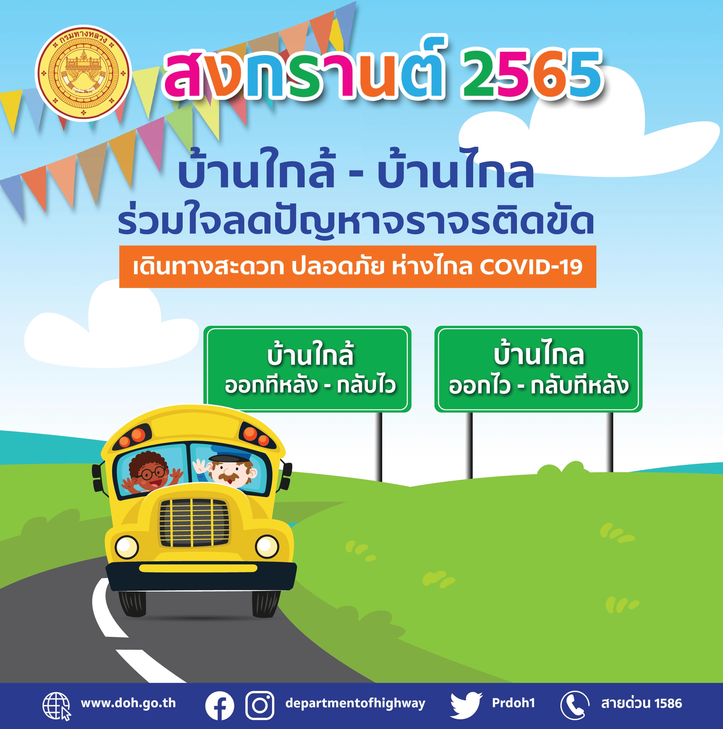 ทั้งนี้ หากประชาชนต้องการสอบถามข้อมูลการเดินทางเพิ่มเติมหรือแจ้งเหตุด่วนเหตุร้ายระหว่างเดินทาง สามารถติดต่อได้ที่สายด่วนกรมทางหลวง 1586 (โทรฟรีทุกเครือข่ายตลอด 24 ชั่วโมง) สายด่วนมอเตอร์เวย์ 1586 กด 7 และตำรวจทางหลวง 1193