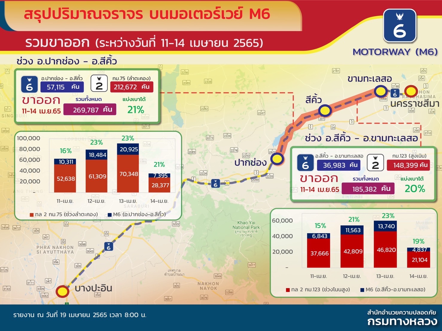 สำหรับการเปิดบริการวิ่งฟรีชั่วคราวบนทางหลวงพิเศษหมายเลข 6 ช่วงปากช่อง – สีคิ้ว – ขามทะเลสอ ในช่วงเทศกาลสงกรานต์พบว่า ระหว่างวันที่ 11 – 14 เมษายน 2565 ที่เปิดให้บริการขาออกจากกรุงเทพมหานคร มีรถใช้บริการ รวมทั้งสิ้น 57,115 คัน สามารถแบ่งเบาปริมาณจราจรขาออกบนถนนมิตรภาพช่วงลำตะคองได้ 21% และระหว่างวันที่ 15 – 18 เมษายน 2565 ที่เปิดให้บริการขาเข้ากรุงเทพมหานคร มีรถใช้บริการทั้งสิ้น 78,256 คัน สามารถแบ่งเบาปริมาณจราจรขาเข้าบนถนนมิตรภาพช่วงลำตะคองได้ 25% นอกจากนี้ สายด่วนกรมทางหลวง 1586 ได้ให้บริการประชาชนในการสอบถามข้อมูลต่าง ๆ อาทิ การขอคำแนะนำเส้นทางการเดินทาง สอบถามสภาพการจราจร สอบถามระยะเวลาในการเดินทาง แจ้งเหตุรถเสีย และขอความช่วยเหลือเรื่องต่าง ๆ เป็นต้น โดยตั้งแต่วันที่ 8 – 18 เมษายน 2565 พบว่า มีปริมาณสายเรียกเข้า จำนวน 11,564 ครั้ง สายเรียกเข้ามากที่สุดในช่วงเวลา 08.00 – 16.00 น. จำนวน 6,642 ครั้ง