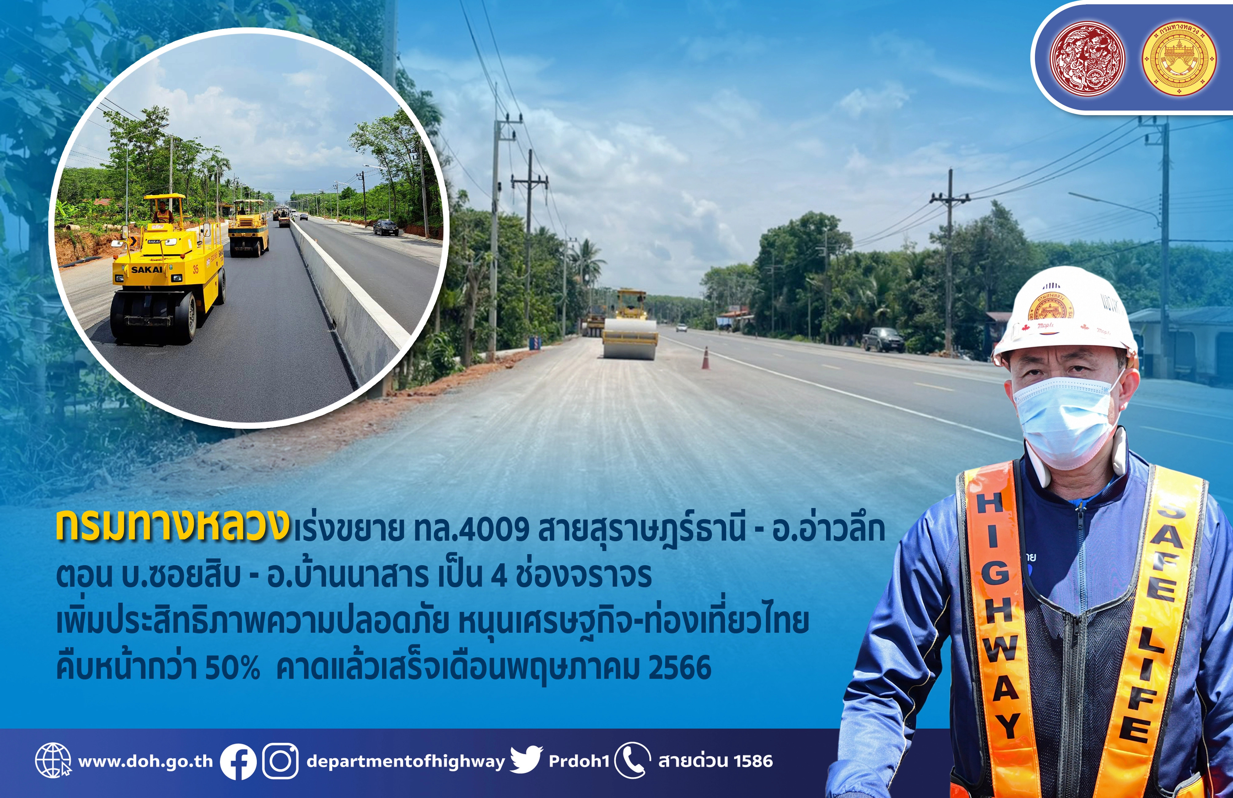 นายสราวุธ ทรงศิวิไล อธิบดีกรมทางหลวง เปิดเผยว่า ตามที่นายศักดิ์สยาม ชิดชอบ รัฐมนตรีว่าการกระทรวงคมนาคม  ได้มอบนโยบายให้กรมทางหลวงขับเคลื่อนพัฒนาโครงข่ายทางหลวงและมาตรฐานความปลอดภัยในเส้นทางพร้อมได้ติดตามและเร่งรัดให้ดำเนินโครงการที่อยู่ระหว่างการก่อสร้างให้แล้วเสร็จทันตามกำหนด รวมทั้งให้เร่งดำเนินโครงการก่อสร้างขยายทางหลวงหมายเลข 4009 สาย สุราษฎร์ธานี – อ.อ่าวลึก ตอน บ.ซอยสิบ – อ.บ้านนาสาร ให้มีขนาด 4 ช่องจราจรในพื้นที่จังหวัดสุราษฎร์ธานี เพื่อยกระดับโครงข่ายคมนาคม รองรับปริมาณการจราจรให้ผู้ใช้เส้นทางเดินทางด้วยความสะดวกรวดเร็วปลอดภัย ช่วยเสริมศักยภาพกระจายความเจริญด้านเศรษฐกิจและการท่องเที่ยวในพื้นที่ภาคใต้สู่การพัฒนาเศรษฐกิจอย่างยั่งยืนตามนโยบายของรัฐบาล