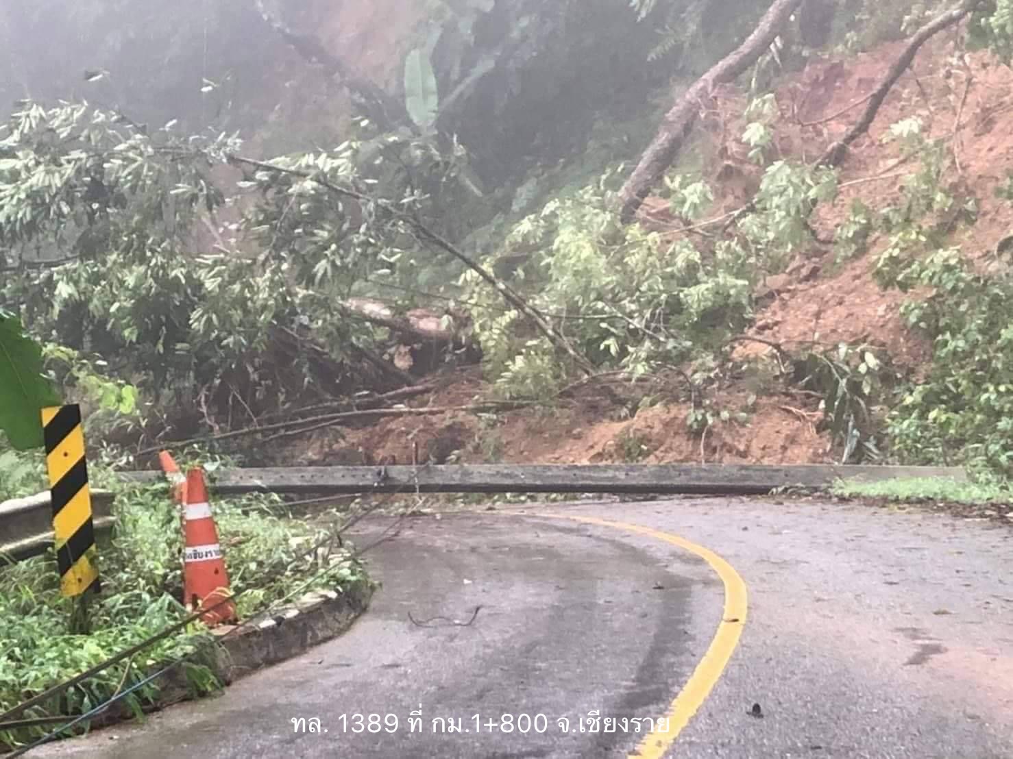 - ทางหลวงหมายเลข 1389 ตอน สถานีเพาะพันธุ์สัตว์ป่าดอยตุง - วัดพระธาตุดอยตุง พื้นที่อำเภอแม่สาย ช่วงกม.ที่ 1+800 ด้านซ้ายทาง ดินสไลด์ปิดทับเส้นทางจราจร 2 ช่องจราจร และเสาไฟฟ้าล้มทับเส้นทางจราจร ปัจจุบันอยู่ระหว่างการเคลื่อนย้ายวัสดุ และกรมทางหลวงได้จัดเจ้าหน้าที่คอยอำนวยความสะดวก แนะนำเส้นทางเลี่ยง ใช้ทางหลวงหมายเลข 1149