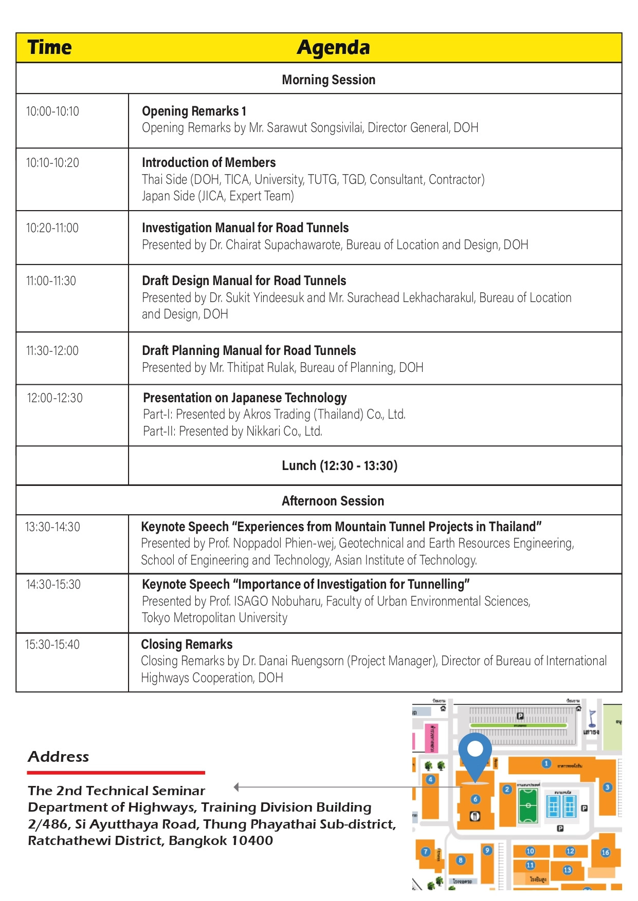 จัดสัมมนาทางวิชาการ ครั้งที่ 2 เพื่อนำเสนอภาพรวมความก้าวหน้าของโครงการพัฒนาสมรรถนะการบริหารงานโครงการอุโมงค์ในประเทศไทย (Project for Capacity Development on Tunnel Project Management in Thailand) ระยะเวลาโครงการประมาณ 4 ปี (เริ่มต้นในปี พ.ศ. 2564) รวมถึงการบรรยายพิเศษที่เกี่ยวกับการดำเนินงานโครงการอุโมงค์ ในวันอังคารที่ 27 กันยายน 2565 เวลา 10.00-16.00 น. ณ ห้องสัมมนาเทิดศักดิ์ เศรษฐมานพ ชั้น 3 กองฝึกอบรม กรมทางหลวง และการสัมมนาผ่านสื่อออนไลน์ แอพพลิเคชั่น ZOOM