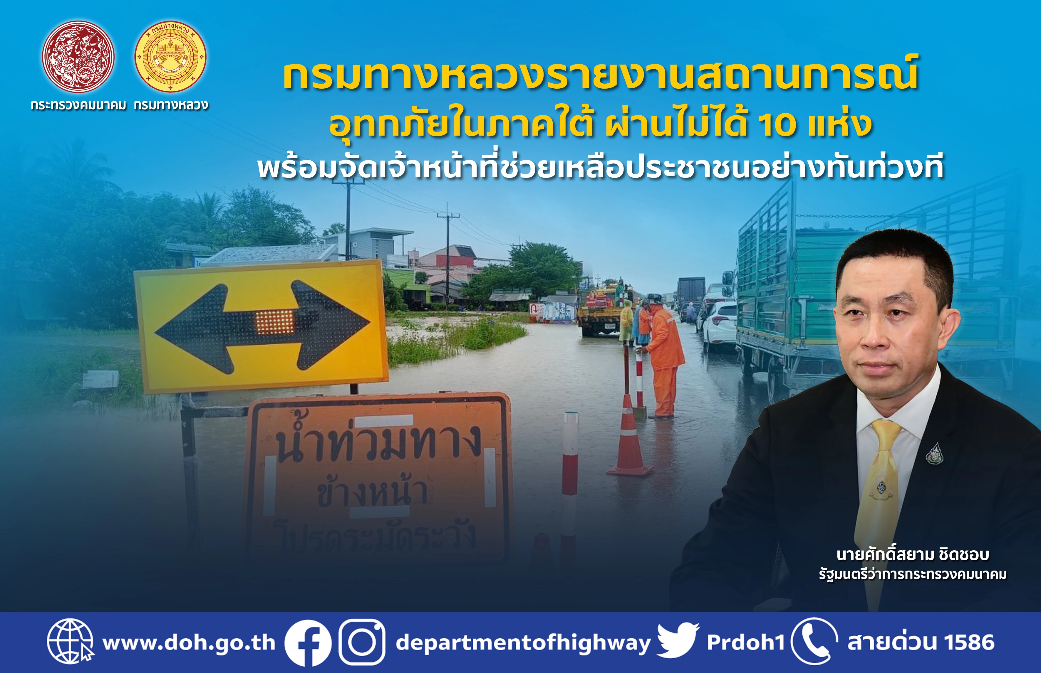 กรมทางหลวงรายงานสถานการณ์อุทกภัยในภาคใต้ ผ่านไม่ได้ 10 แห่ง พร้อมจัดเจ้าหน้าที่ช่วยเหลือประชาชนอย่างทันท่วงที