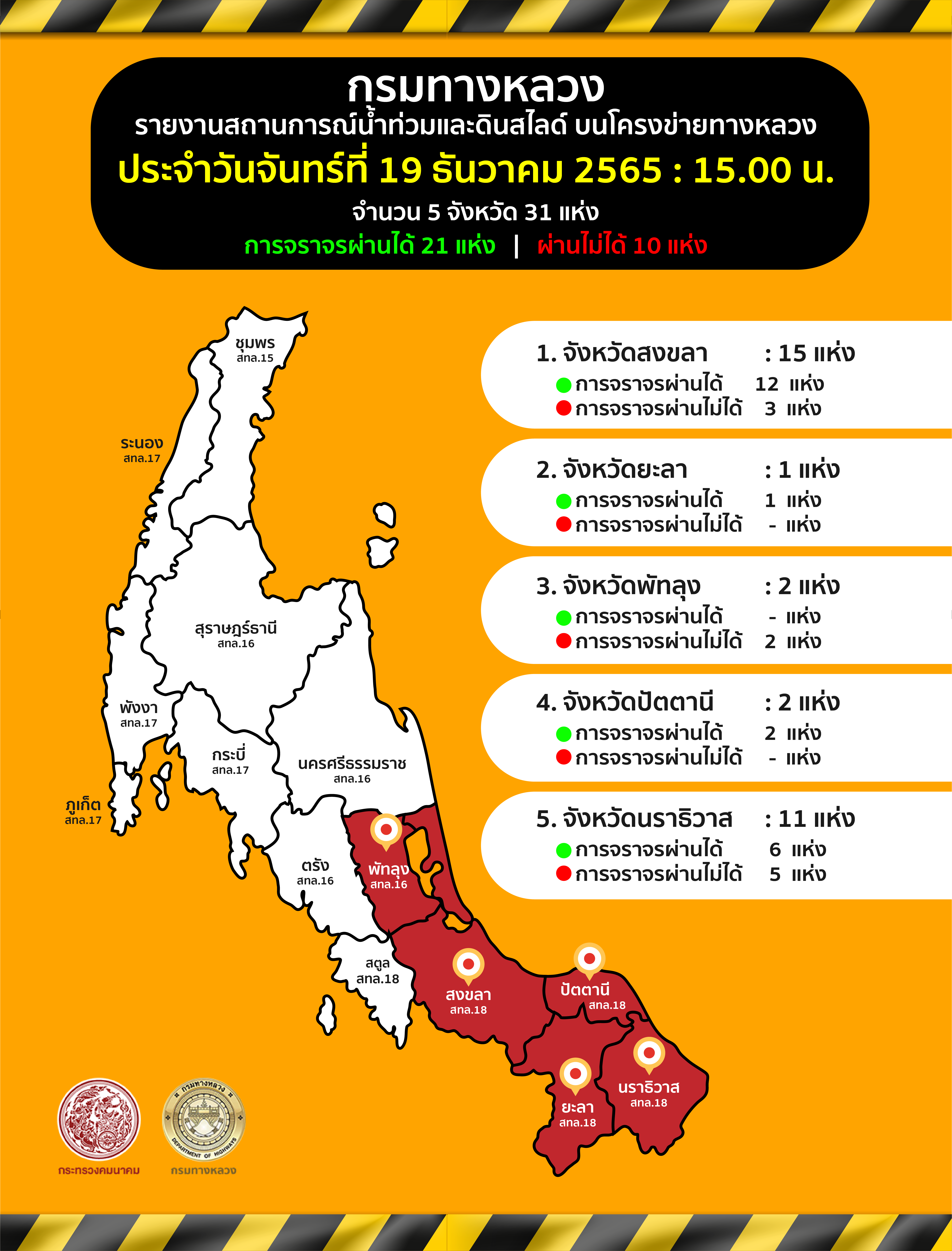 พร้อมกันนี้กรมทางหลวง ได้ทำการสรุปสถานการณ์อุทกภัยและดินสไลด์บนทางหลวง โดย สถานการณ์ประจำวันที่ 19 ธันวาคม 2565 เวลา 15.00 น. พบทางหลวงถูกน้ำท่วม/ดินสไลด์ ในพื้นที่ ภาคใต้ จำนวน 5 จังหวัด 21 สายทาง 31 แห่ง ที่การจราจรผ่านไม่ได้ 10 แห่ง ดังนี้