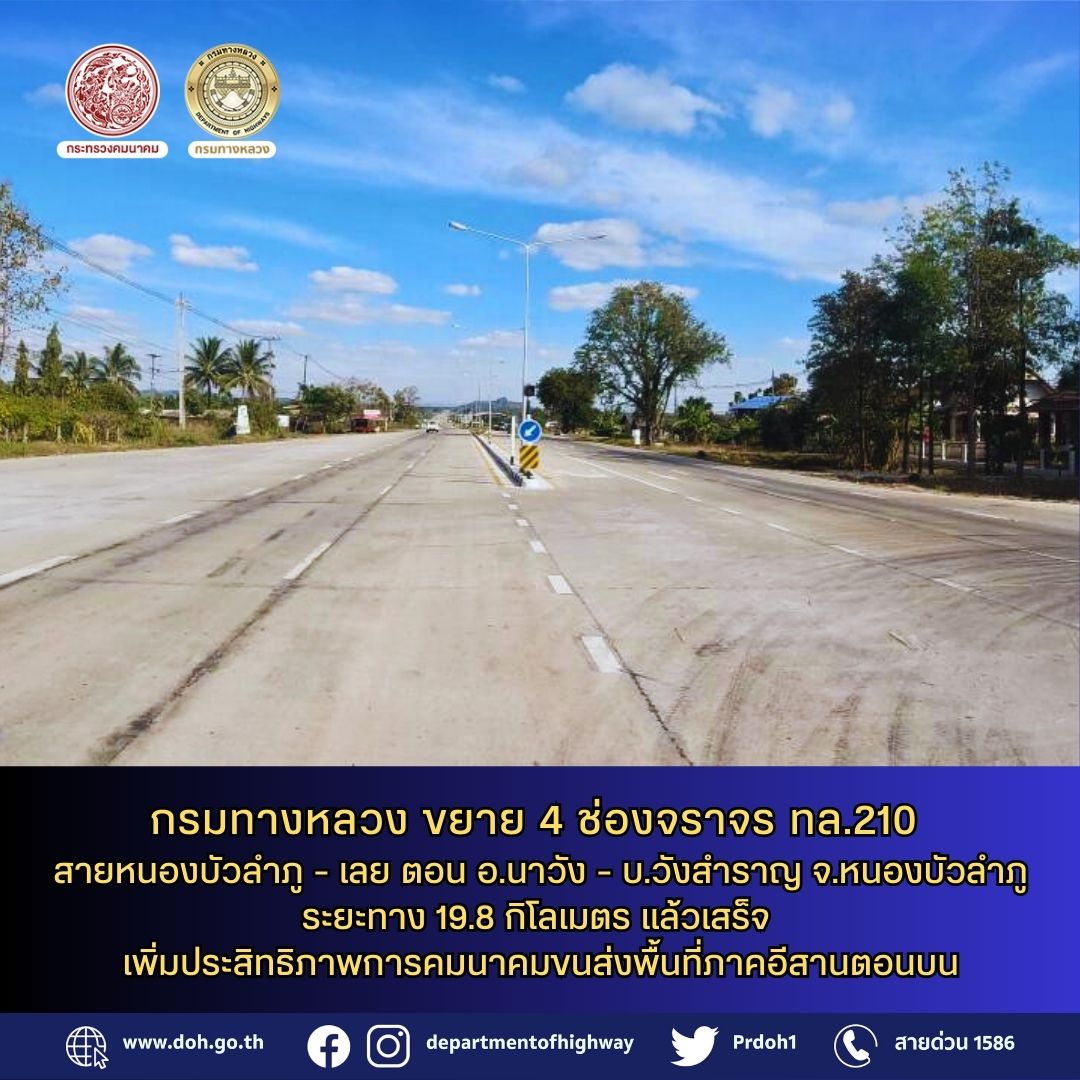 กรมทางหลวง โดยสำนักก่อสร้างทางที่ 2 ดำเนินการโครงการก่อสร้างทางหลวงหมายเลข 210 สายหนองบัวลำภู - เลย ตอน อ.นาวัง-บ.วังสำราญ จ.หนองบัวลำภู ระยะทาง 19.844 กิโลเมตร เป็น 4 ช่องจราจร แล้วเสร็จ เชื่อมโครงข่ายคมนาคมขนส่งภาคอีสานตอนบน