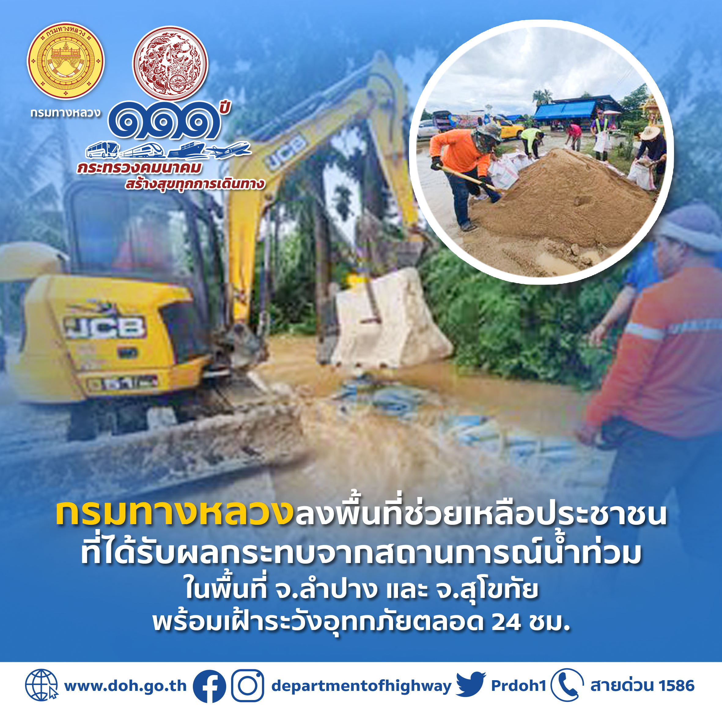 ทั้งนี้ ขอให้ประชาชนเดินทางด้วยความระมัดระวัง ปฏิบัติตามป้ายเตือนน้ำท่วม ป้ายแนะนำ และคำแนะนำของเจ้าหน้าที่อย่างเคร่งครัด เพื่อความปลอดภัยในการเดินทาง พร้อมช่วยเหลือผู้ประสบภัยและเผ้าระวังสถานการณ์ตลอดเวลา หากประชาชนต้องการสอบถามสภาพเส้นทาง สภาพการจราจร หรือต้องการความช่วยเหลือสามารถติดต่อได้ที่สำนักงานทางหลวง แขวงทางหลวง หมวดทางหลวงในพื้นที่ และสายด่วนกรมทางหลวง 1586 (โทรฟรีทุกเครือข่ายตลอด 24 ชั่วโมง) และสามารถติดตามการรายงานสถานการณ์สภาพเส้นทางได้ที่ www.doh.go.th หรือ ทวิตเตอร์กรมทางหลวง @prdoh1