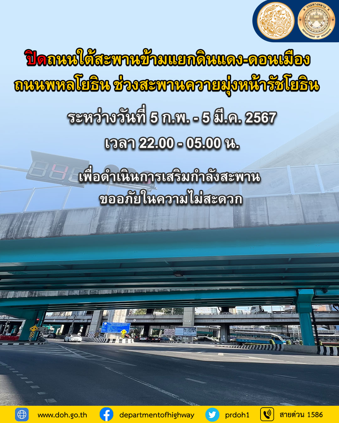 กรมทางหลวงขอแจ้งประชาสัมพันธ์ปิดถนนใต้สะพานข้ามเเยกดินแดง - ดอนเมือง/พหลโยธิน (สะพานควายมุ่งหน้ารัชโยธินและพหลโยธินไปดอนเมือง) เพื่อดำเนินการเสริมกำลังสะพาน (Strengthening) ตั้งแต่เวลา 22:00 - 05:00 น. ระหว่างวันที่ 5 กุมภาพันธ์ - 5 มีนาคม 2567