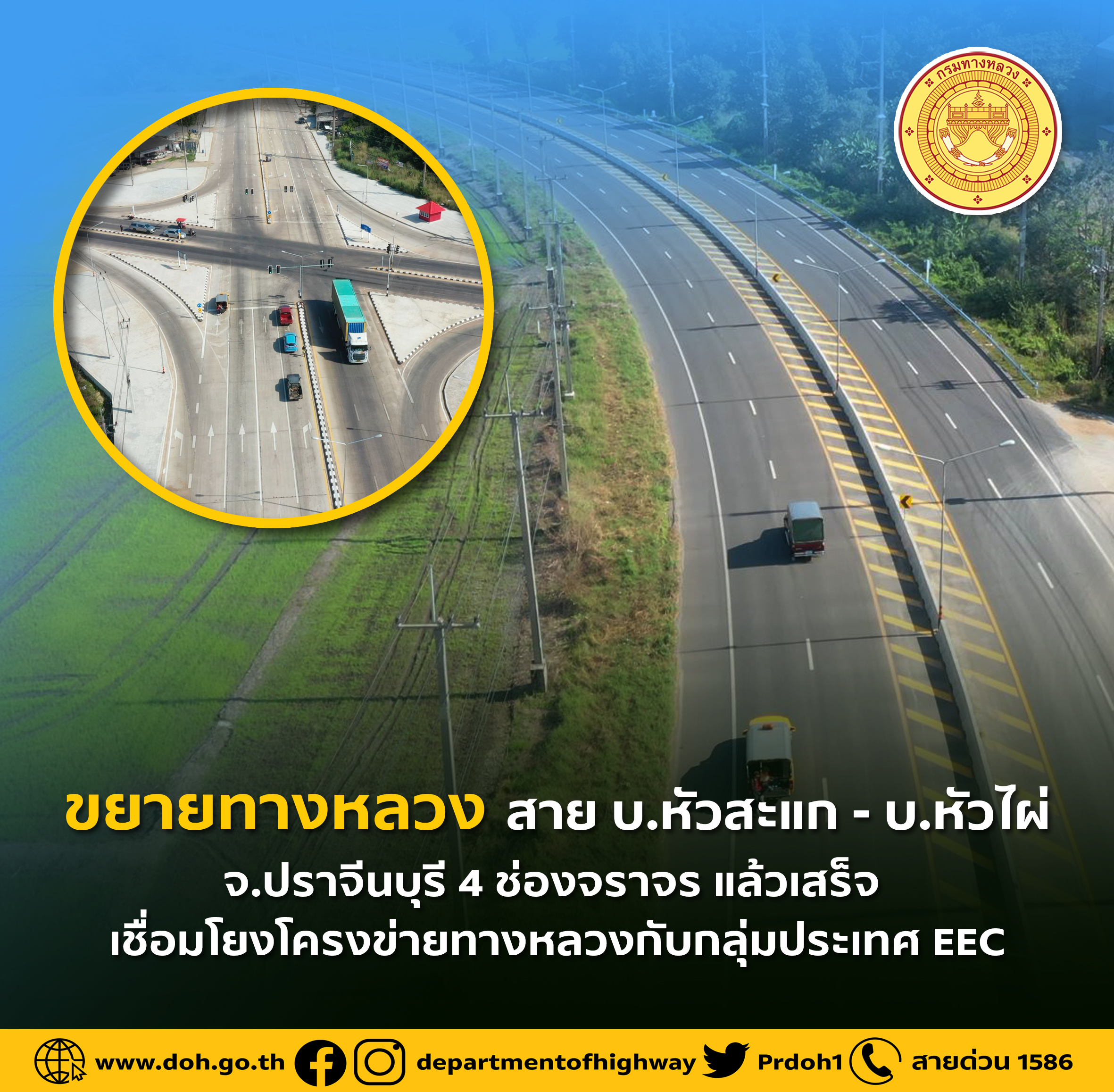 กรมทางหลวงขยายทางหลวงหมายเลข 3481 สาย บ.หัวสะแก - บ.หัวไผ่ จ.ปราจีนบุรี แล้วเสร็จ เพื่อเพิ่ม ประสิทธิภาพในการรองรับปริมาณจราจรที่เพิ่มสูงขึ้น และเสริมสร้างโครงข่ายการคมนาคมระหว่างภาคตะวันออกกับภาคตะวันออกเฉียงเหนือ
