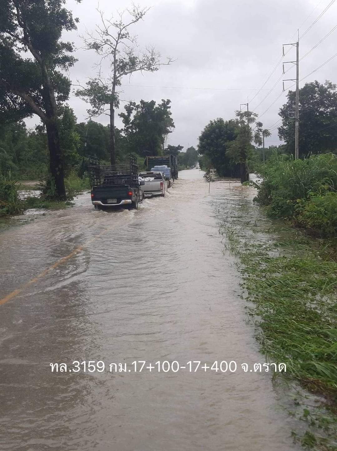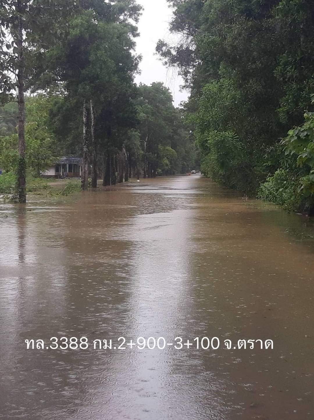 3. ทางหลวงหมายเลข 3158 แสนตุ้ง - หนองบัว ช่วง กม.29+600 – 30+400 ในพื้นที่อำเภอเขาสมิง จังหวัดตราด ระดับน้ำสูง 50 ซม. ทำให้การจราจรผ่านไม่ได้ แนะนำให้ใช้ทางหลวงท้องถิ่นเป็นทางเลี่ยง