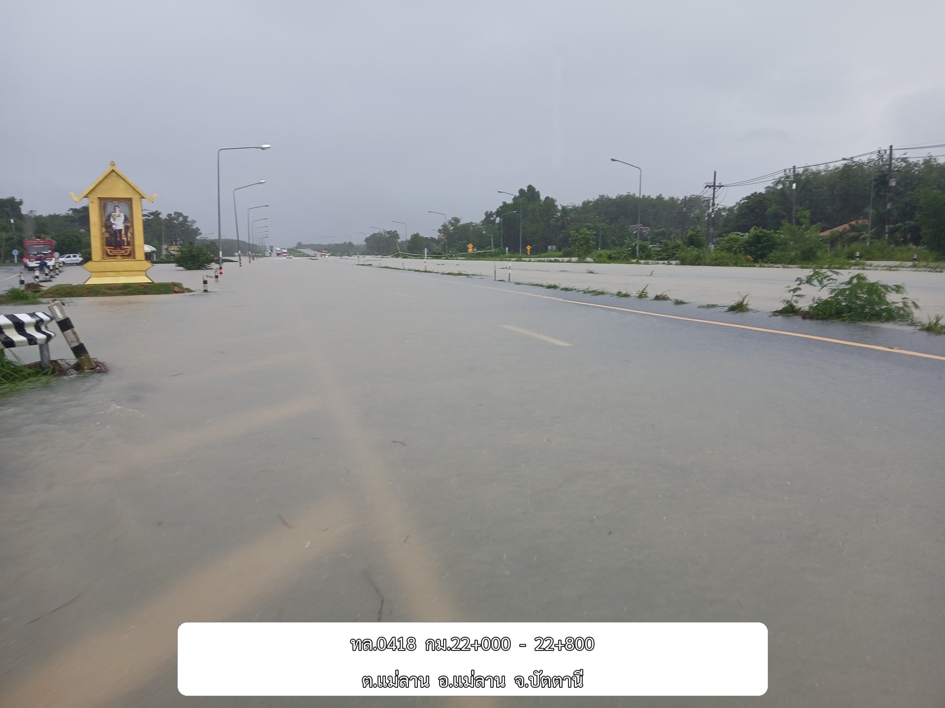 •ทล.42 นาจวก – ดอนยาง ช่วง กม.ที่ 76+900 - 77+250 อ.โคกโพธิ์ จ.ปัตตานี ระดับน้ำ 15 ซม.