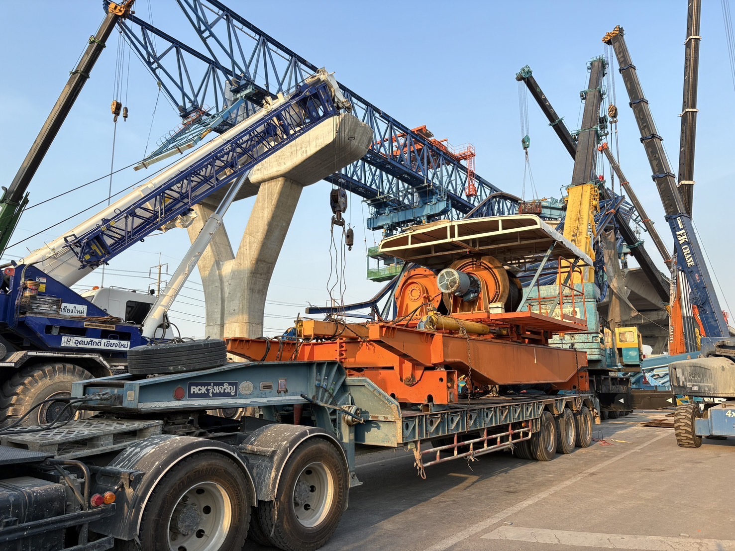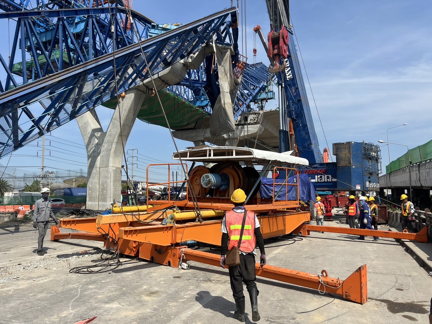 เมื่อวานนี้ (6 ธันวาคม 2567) ทีมวิศวกรได้ดำเนินการตัดชุด Winch ที่ติดกับโครงสร้างเหล็ก เสร็จสิ้นเป็นที่เรียบร้อย โดยดำเนินการตามขั้นตอนอย่างเคร่งครัด ได้แก่ ตัดย่อยอุปกรณ์ที่เกี่ยวข้องกับ Winch เช่น บันไดขึ้น-ลง, สลิง, แกะตู้ Control ออกจาก Winch ลงด้านล่าง, ตัดตะแกรงกันตกชิ้นแรก, ยกชุดรอก Winch ลงมาจากโครงเหล็ก, นำโครงเหล็กชุด Winch ออกจากพื้นที่ และตัดลวดสลิงที่กีดขวางโครงสร้างเหล็ก Truss ออก เพื่อเตรียมความพร้อมสำหรับการรื้อถอนโครงสร้างเหล็ก Truss ที่ได้รับความเสียหายในวันนี้ (7 ธันวาคม 2567) โดยเริ่มจากด้านหลังและยกลงมาด้านล่างล่าสุดเมื่อเวลา 10.00 น. ดร.อรรถสิทธิ์ ศิริสนธิ ที่ปรึกษาคณะอนุกรรมการสาขาวิศวกรรมโครงสร้างและสะพาน วิศวกรรมสถานแห่งประเทศไทย ในพระบรมราชูปถัมภ์ (วสท.) พร้อมด้วยทีมวิศวกรผู้เชี่ยวชาญ ได้ลงพื้นที่ตรวจสอบความพร้อมก่อนการรื้อย้าย Launching Gantry (LG) โดยมีการดำเนินการ ดังนี้