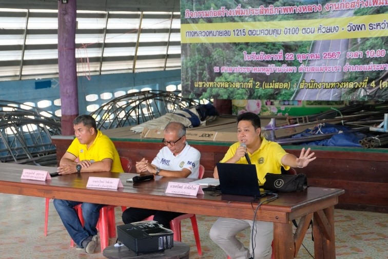 1.1 เพื่อเผยแพร่ประชาสัมพันธ์ข้อมูลข่าวสาร "โครงการก่อสร้างโครงข่ายทางหลวงแผ่นดิน กิจกรรมก่อสร้างเพิ่มประสิทธิภาพทางหลวง งานก่อสร้างเพิ่มประสิทธิภาพทางหลวง" ทางหลวงหมายเลข 1215 ให้ประชาชน และผู้มีส่วนได้ส่วนเสียที่อาศัยอยู่สองข้างทางในบริเวณพื้นที่โครงการ