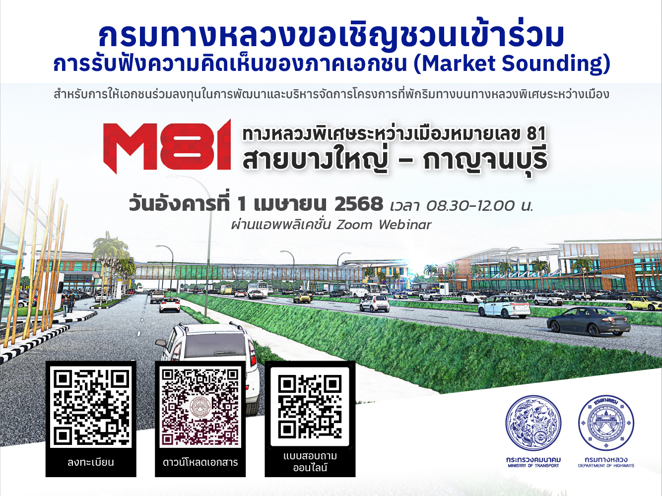 กรมทางหลวงจะดำเนินการเปิดรับฟังความคิดเห็นภาคเอกชน (Market Sounding) สำหรับการให้เอกชนร่วมลงทุนในการพัฒนาและบริหารจัดการโครงการที่พักริมทางบนทางหลวงพิเศษระหว่างเมืองหมายเลข 81