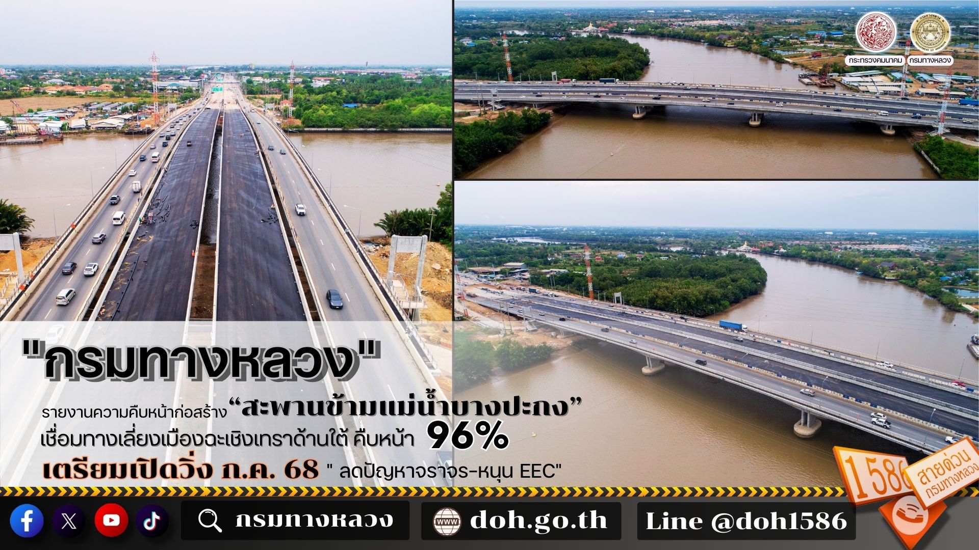 กรมทางหลวงรายงานความคืบหน้าก่อสร้าง 'สะพานข้ามแม่น้ำบางปะกง' เชื่อมทางเลี่ยงเมืองฉะเชิงเทราด้านใต้ คืบหน้า 96% เตรียมเปิดวิ่ง ก.ค. นี้" ลดปัญหาจราจร-หนุน EEC"