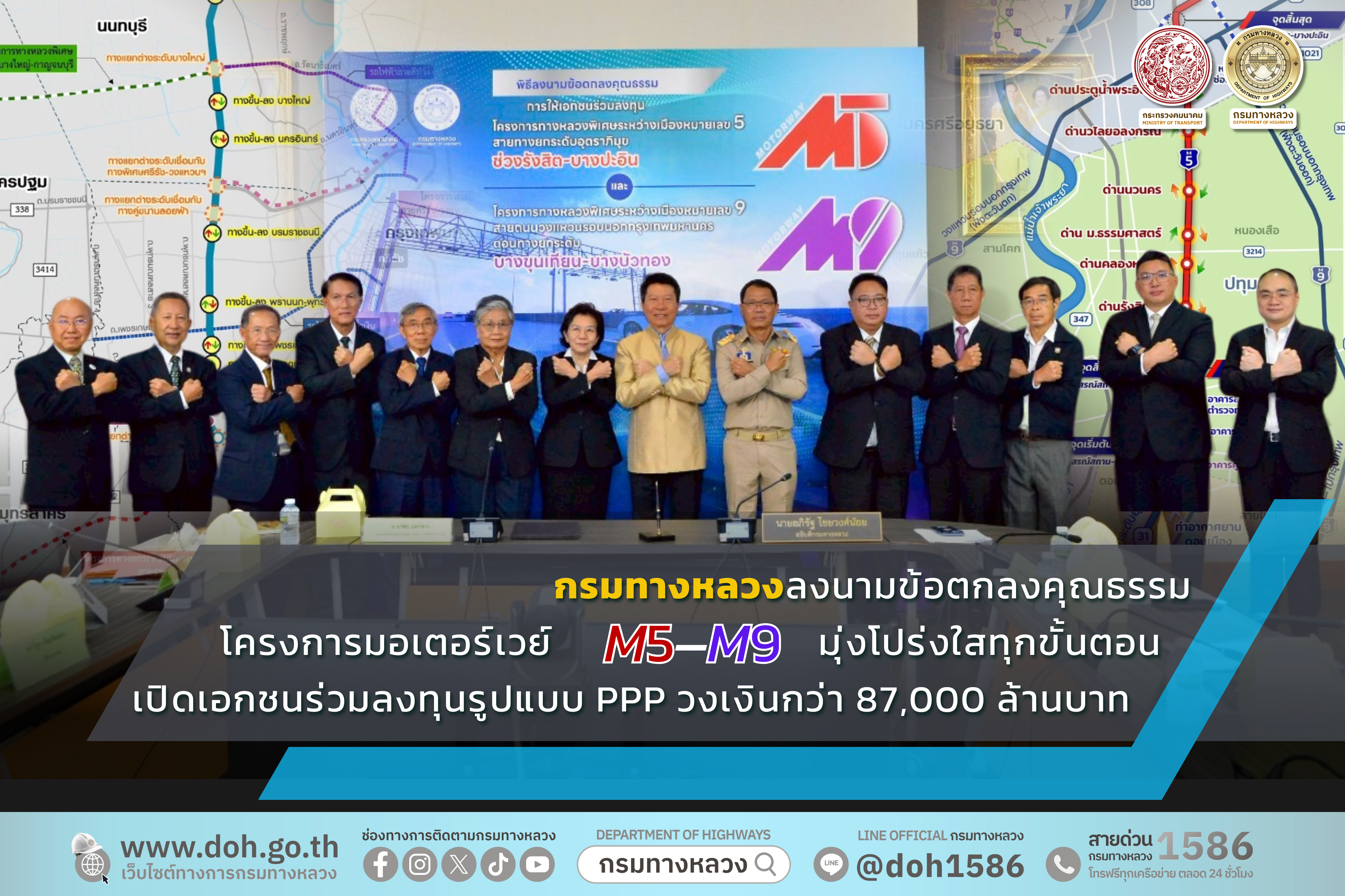 กรมทางหลวงลงนามข้อตกลงคุณธรรม โครงการมอเตอร์เวย์ M5 – M9 มุ่งโปร่งใสทุกขั้นตอน เปิดเอกชนร่วมลงทุนรูปแบบ PPP วงเงินกว่า 87,000 ล้านบาท