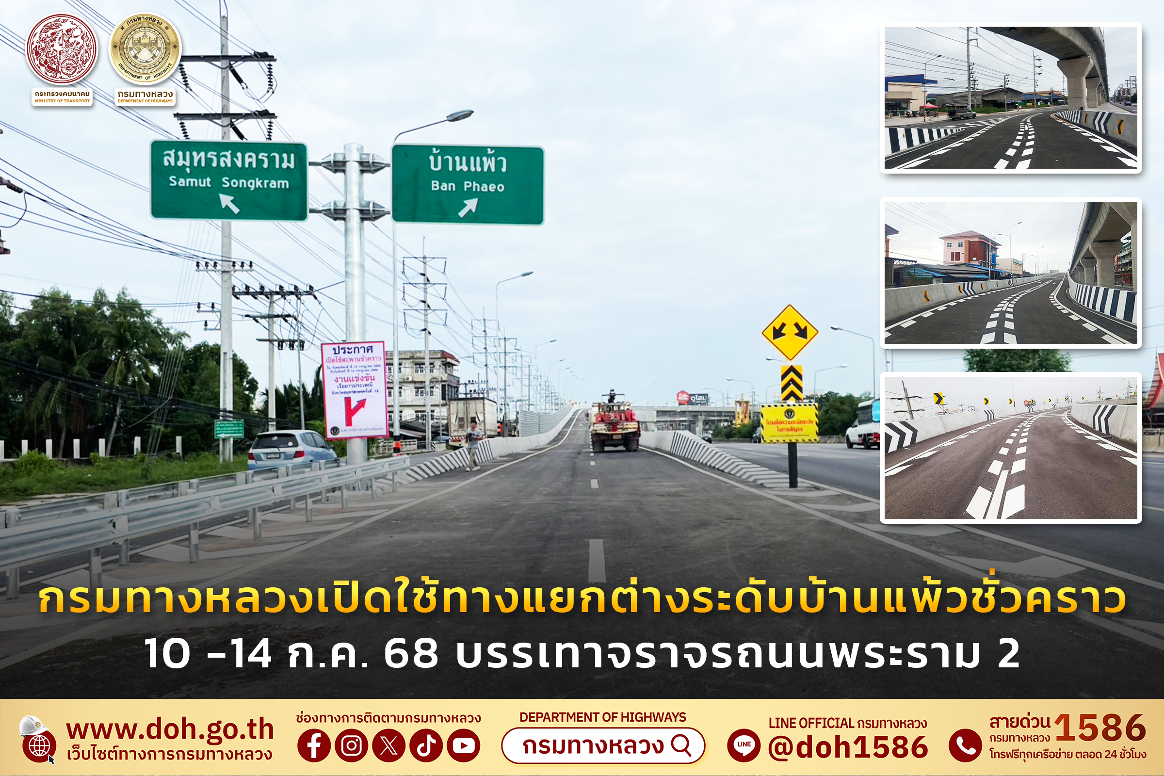 กรมทางหลวงเปิดใช้ทางแยกต่างระดับบ้านแพ้ว จังหวัดสมุทรสาคร (ขาเข้า อ.บ้านแพ้ว) ชั่วคราว 2 ช่องจราจร ระหว่างวันที่ 10 ก.ค. เวลา 08.00 น. ถึง 14 ก.ค. 68 เที่ยงคืน เพื่อช่วยอำนวยความสะดวกและระบายรถบนถนนพระราม 2