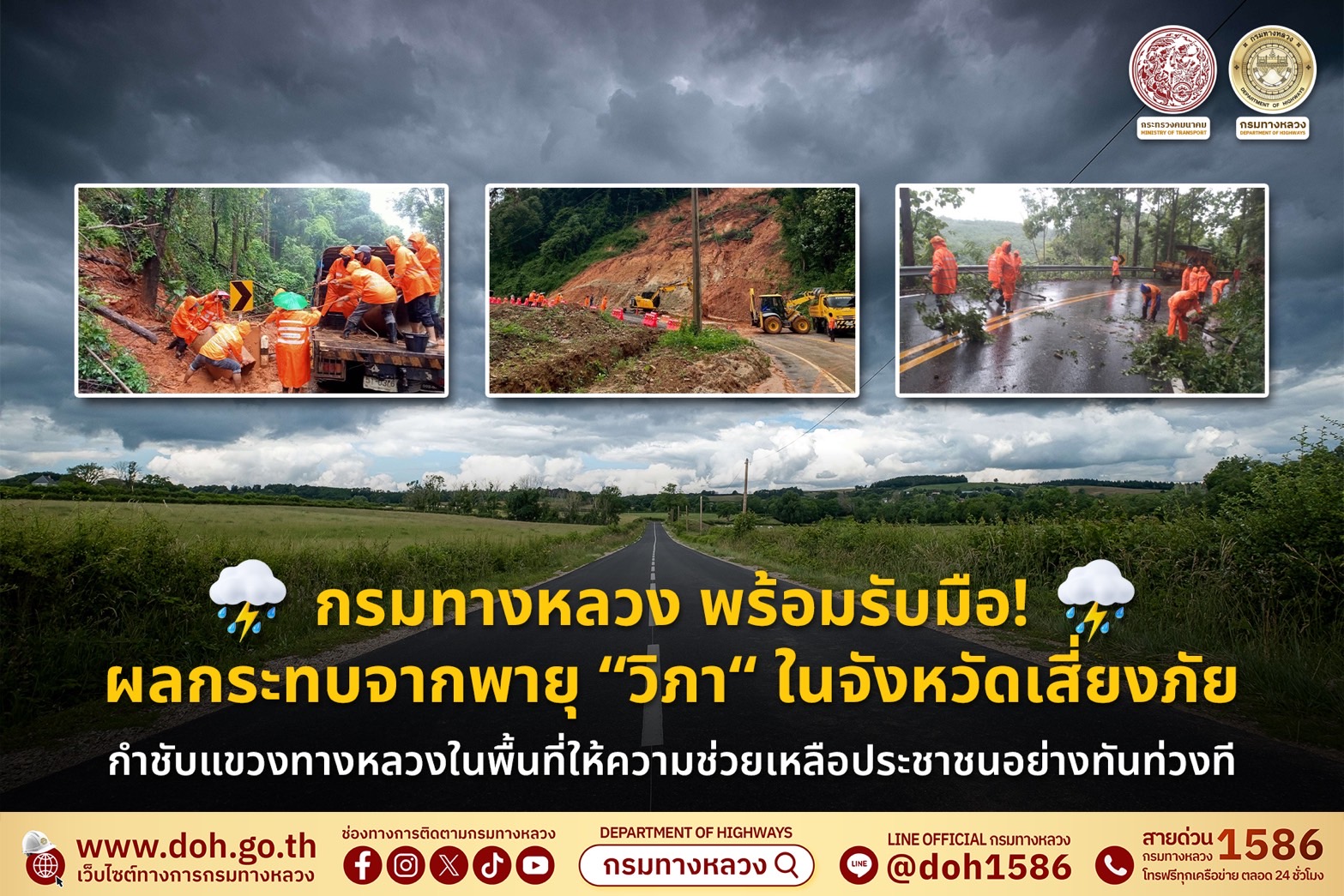 กรมทางหลวง พร้อมรับมือผลกระทบจากพายุ “วิภา” ในจังหวัดเสี่ยงภัย เพื่ออำนวยความสะดวกและปลอดภัยให้กับผู้ใช้ทางหลวงตลอดเส้นทาง