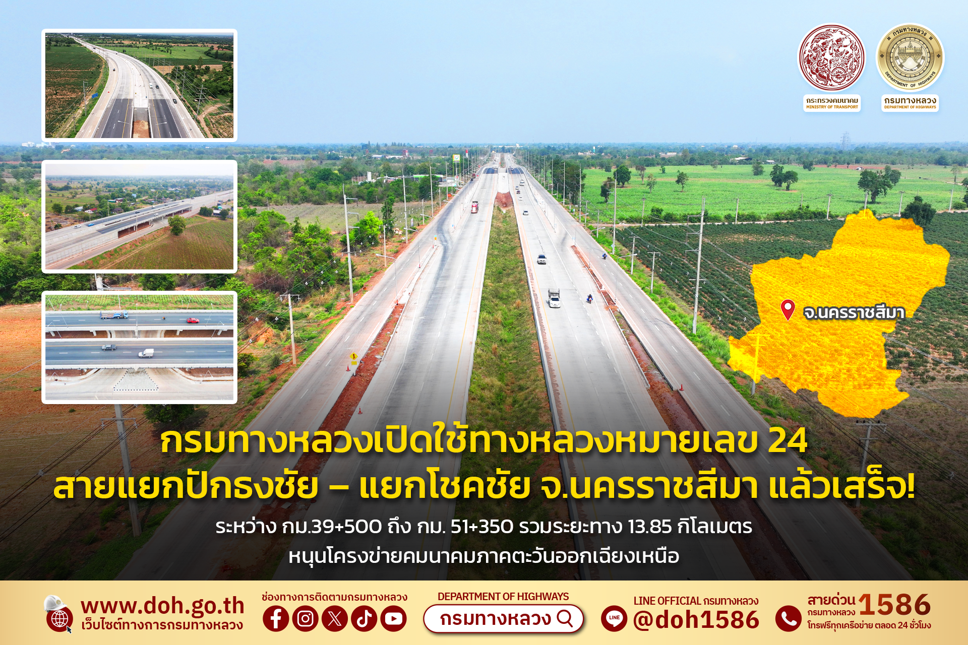 นายอภิรัฐ โชยวงศ์น้อย อธิบดีกรมทางหลวง เปิดเผยว่า กรมทางหลวง โดยสำนักก่อสร้างทางที่ 2 ได้ดำเนินการโครงการก่อสร้างทางหลวงหมายเลข 24 สายแยกปักธงชัย - แยกโชคชัย ระหว่าง กม.ที่ 39+500 ถึง กม.ที่ 51+350 พื้นที่จังหวัดนครราชสีมา รวมระยะทาง 11.850 กิโลเมตร แล้วเสร็จสมบูรณ์ โดยโครงการนี้มีวัตถุประสงค์เพื่อเพิ่มศักยภาพโครงข่ายคมนาคมขนส่งและการท่องเที่ยวในจังหวัดนครราชสีมาและภาคตะวันออกเฉียงเหนือ ทางหลวงหมายเลข 24 หรือ "ถนนสีคิ้ว - อุบลราชธานี" เป็นเส้นทางสำคัญที่เชื่อมต่อระหว่างประเทศไทยกับสาธารณรัฐประชาธิปไตยประชาชนลาว ที่ด่านช่องเม็ก จังหวัดอุบลราชธานี และประตูการค้าไทย – กัมพูชา ที่ด่านช่องจอม จ.สุรินทร์ โดยทางหลวงสายนี้มีจุดเริ่มต้นที่ อ.สีคิ้ว จ.นครราชสีมา และสิ้นสุดที่ อ.วารินชำราบ จ.อุบลราชธานี ปัจจุบันมีปริมาณการจราจรหนาแน่นส่งผลให้เกิดปัญหาการจราจรติดขัดและอุบัติเหตุบ่อยครั้งในพื้นที่ อ.ปักธงชัย และ อ.โชคชัย จ.นครราชสีมา ดังนั้น กรมทางหลวงได้คำนึงถึงความสะดวกและความปลอดภัยในการเดินทางของประชาชนจึงได้ดำเนินโครงการก่อสร้างทางหลวงหมายเลข 24 ช่วงแยกปักธงชัย - แยกโชคชัย เพื่อแก้ไขปัญหาการจราจรในปัจจุบันและรองรับปริมาณจราจรในอนาคตเพื่อแก้ปัญหาระยะยาว