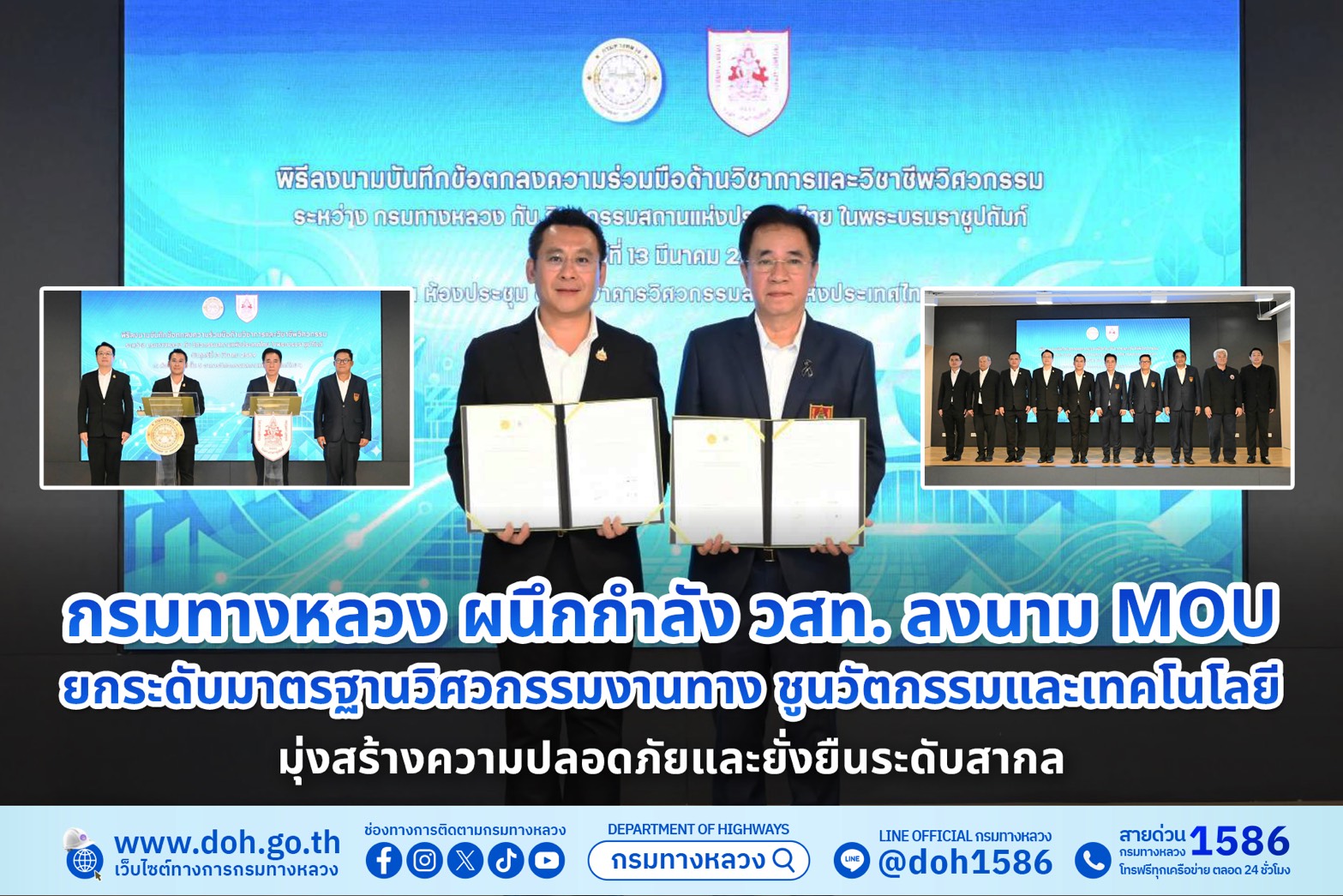 กรมทางหลวง (ทล.) กระทรวงคมนาคม ร่วมกับ วิศวกรรมสถานแห่งประเทศไทย ในพระบรมราชูปถัมภ์ (วสท.) จัดพิธีลงนามบันทึกข้อตกลงความร่วมมือ (MOU) ด้านวิชาการและวิชาชีพวิศวกรรม มุ่งบูรณาการองค์ความรู้เพื่อขับเคลื่อนโครงสร้างพื้นฐานของไทยสู่ความยั่งยืน ณ ห้องประชุมวิศวกรรมสถานแห่งประเทศไทยฯ โดยมี นายปิยพงษ์ จิวัฒนกุลไพศาล อธิบดีกรมทางหลวง และ รองศาสตราจารย์ เอนก ศิริพานิชกร นายกวิศวกรรมสถานแห่งประเทศไทยฯ เป็นผู้ลงนาม ท่ามกลางคณะผู้บริหารและแขกผู้มีเกียรติจากทั้งสององค์กร