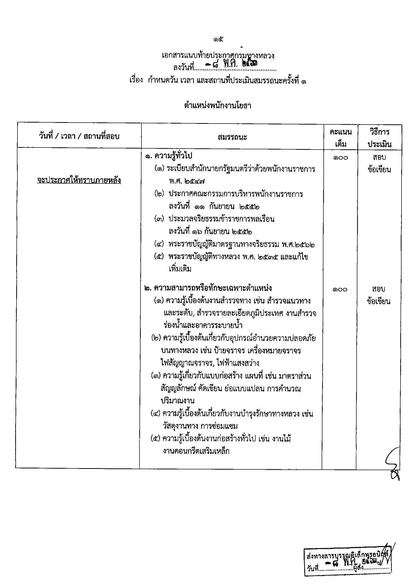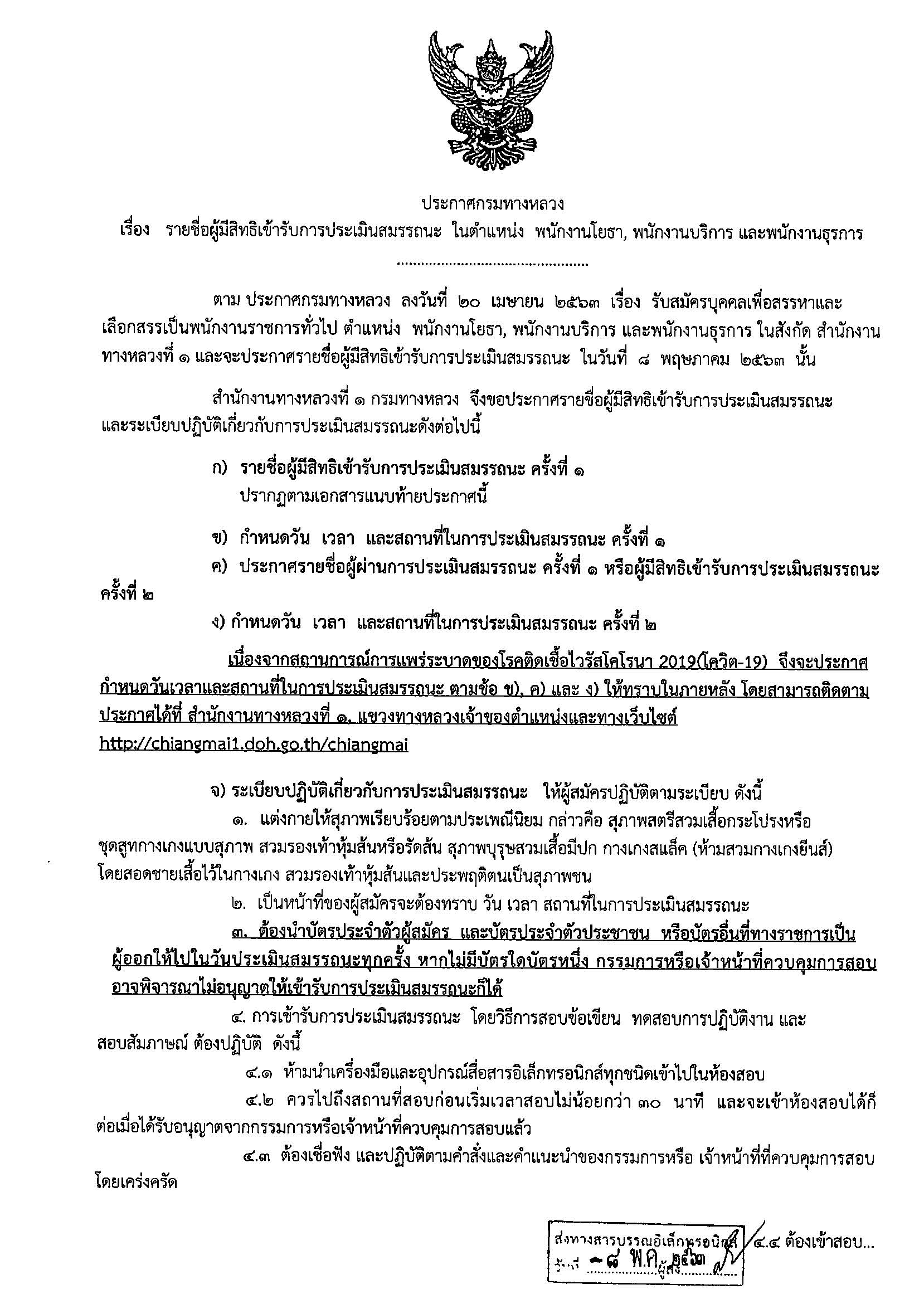 แขวงทางหลวงเชียงใหม่ที่ 2ประกาศรายชื่อผู้มีสิทธิเข้ารับการประเมินสมรรถนะ เพื่อสรรหาและเลือกสรรเป็นพนักงานราชการ ตำแหน่งพนักงานโยธา??สำหรับวัน เวลา และสถานที่ ทางสำนักงานทางหลวงที่ 1 (เชียงใหม่) จะประกาศให้ทราบในภายหลัง