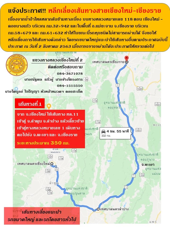 เนื่องจากน้ำป่าไหลหลากล้นข้ามทางเบี่ยง บนทางหลวงหมายเลข 118 ตอน เชียงใหม่ - ดอยนางแก้ว บริเวณ กม.32+942 และในพื้นที่ อ.แม่ขะจาน จ.เชียงราย บริเวณ กม.58+679 และ กม.61+632 ทำให้ในขณะนี้รถทุกชนิดไม่สามารถผ่านได้ จึงขอให้หลีกเลี่ยงการใช้เส้นทางดังกล่าว โดยรถขนาดใหญ่แนะนำใช้เส้นทางอื่นตามประกาศฉบับนี้