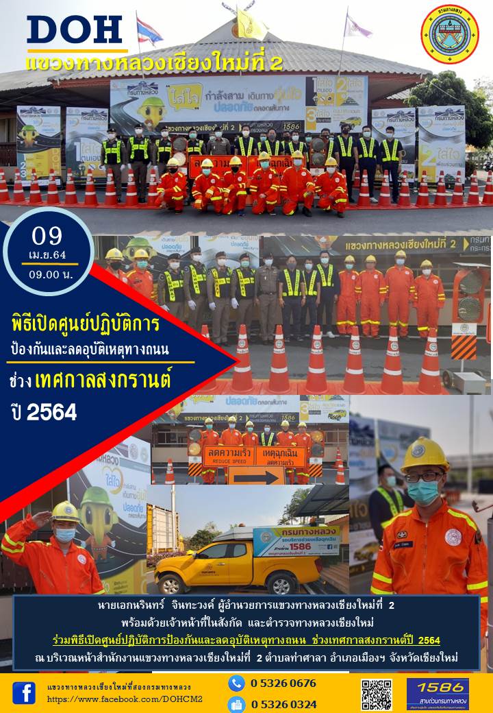 นายเอกนรินทร์ จินทะวงค์ ผู้อำนวยการแขวงทางหลวงเชียงใหม่ที่ 2 พร้อมด้วยเจ้าหน้าที่ในสังกัด และตำรวจทางหลวงเชียงใหม่ ร่วมพิธีเปิดศูนย์ปฏิบัติการป้องกันและลดอุบัติเหตุทางถนน ช่วงเทศกาลสงกรานต์ปี 2564 ณ บริเวณหน้าสำนักงานแขวงทางหลวงเชียงใหม่ที่ 2 ตำบลท่าศาลา อำเภอเมืองฯ จังหวัดเชียงใหม่