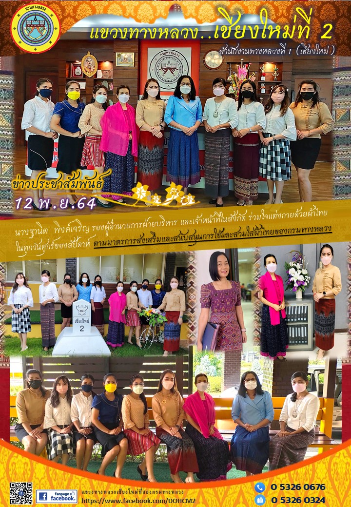 วันศุกร์ที่ 12 พฤศจิกายน นางฐานิต พิงค์เจริญ รองผู้อำนวยการฝ่ายบริหาร และเจ้าหน้าที่ในสังกัด ร่วมใจแต่งกายด้วยผ้าไทยในทุกวันศุกร์ของสัปดาห์ ตามมาตรการส่งเสริมและสนับสนุนการใช้และสวมใส่ผ้าไทยของกรมทางหลวง