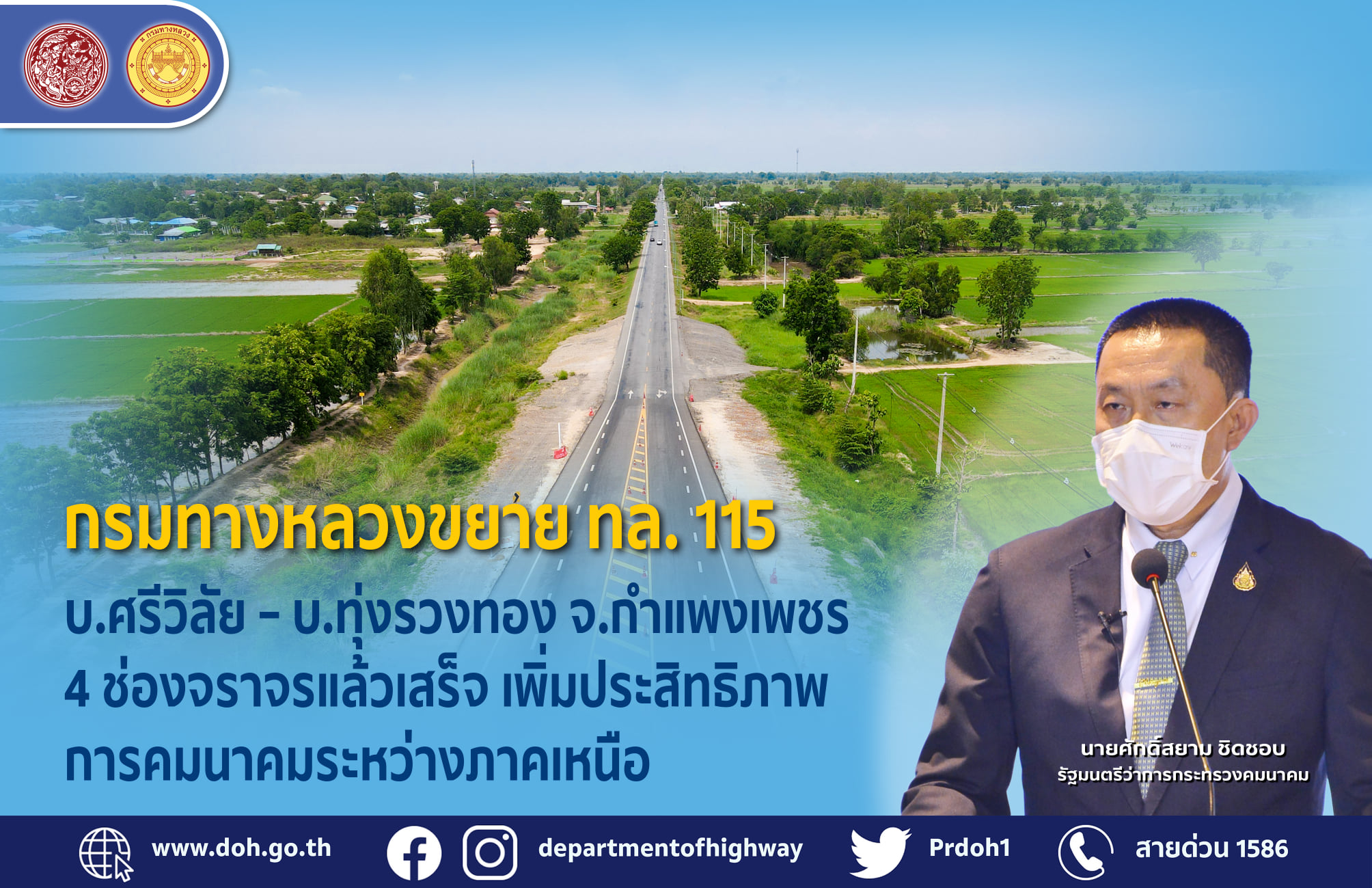 กรมทางหลวง โดย สำนักก่อสร้างทางที่ 1 ดำเนินโครงการก่อสร้างขยายทางหลวงหมายเลข 115 สายกำแพงเพชร – พิจิตร ตอน บ.ศรีวิลัย – บ.ทุ่งรวงทอง จ.กำแพงเพชร แล้วเสร็จ จาก 2 ช่องจราจร เป็น 4 ช่องจราจร ตามแผนงานบูรณาการพัฒนาด้านคมนาคมและระบบโลจิสติกส์ กิจกรรมก่อสร้างทางหลวงแผ่นดิน เป็นช่วงๆระหว่าง กม.25 – กม.31, กม.36 – กม.41 และ กม.42 – กม.47 ระยะทางยาวประมาณ 16.5 กม. ตามนโยบายของนายศักดิ์สยาม ชิดชอบ รัฐมนตรีว่าการกระทรวงคมนาคม ที่ต้องการพัฒนาโครงข่ายสายหลักให้ได้มาตรฐานเชื่อมโยงระหว่างประเทศ