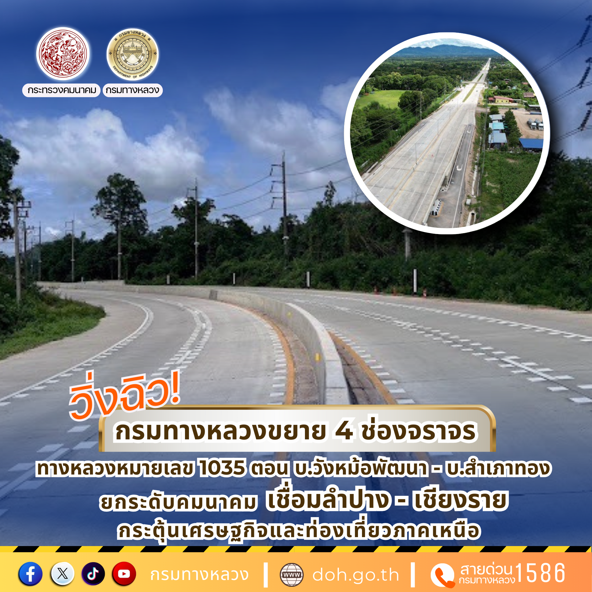 วิ่งฉิว! กรมทางหลวง ขยาย 4 ช่องจราจร ทล.1035 สายบ.วังหม้อพัฒนา - บ.สำเภาทอง แล้วเสร็จ ยกระดับคมนาคม เชื่อมลำปาง - เชียงราย กระตุ้นเศรษฐกิจและท่องเที่ยวภาคเหนือ