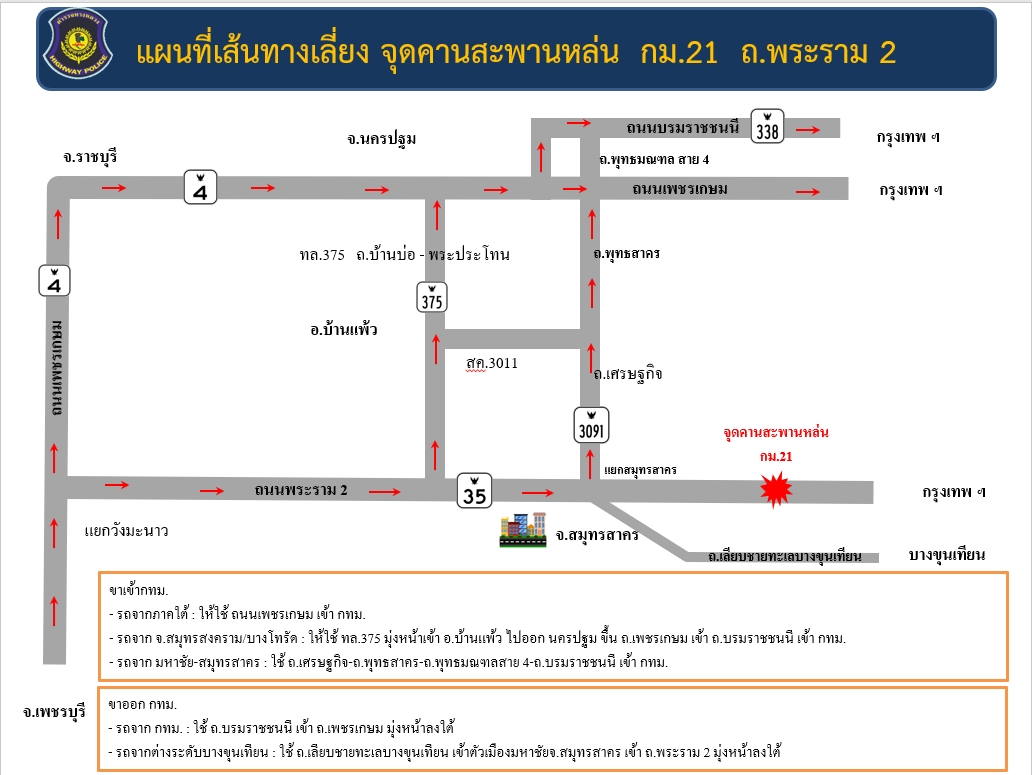 เส้นทางเลี่ยง กรณีเกิดอุบัติเหตุทางยกระดับถล่ม ถ.พระราม2 กม.21+600 (บริเวณช่องทางหลัก ทั้งขาเข้าและออก) ต.คอกกระบือ อ.เมือง จ.สมุทรสาคร