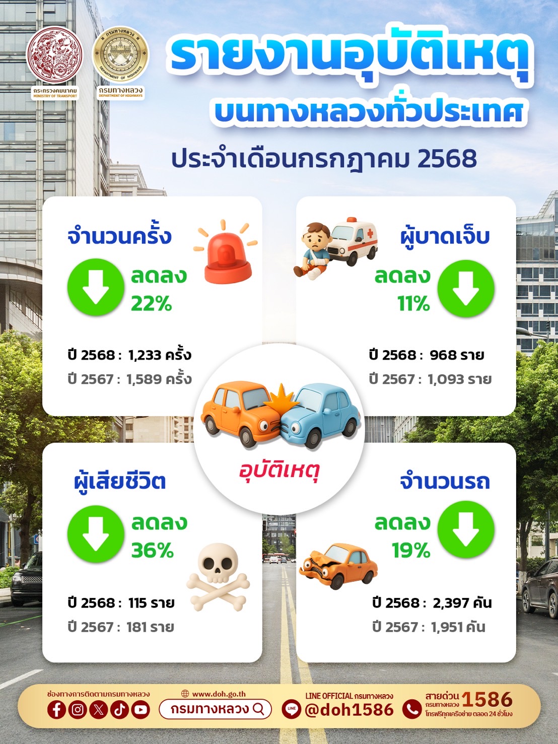 47 18/08/2568 กรมทางหลวง สรุปอุบัติเหตุบนทางหลวงเดือนกรกฎาคม 2568 ลดลง 22% สาเหตุหลักขับเร็วเกินกฎหมายกำหนด