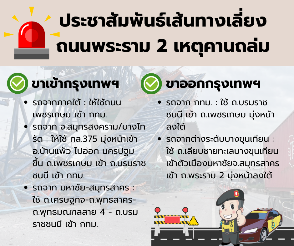 กรมทางหลวงเร่งเดินหน้ารื้อถอนชิ้นส่วนโครงสร้างเหล็กที่เสียหายบนพระราม 2 เน้นย้ำมาตรการความปลอดภัย พร้อมแนะนำเส้นทางเลี่ยง