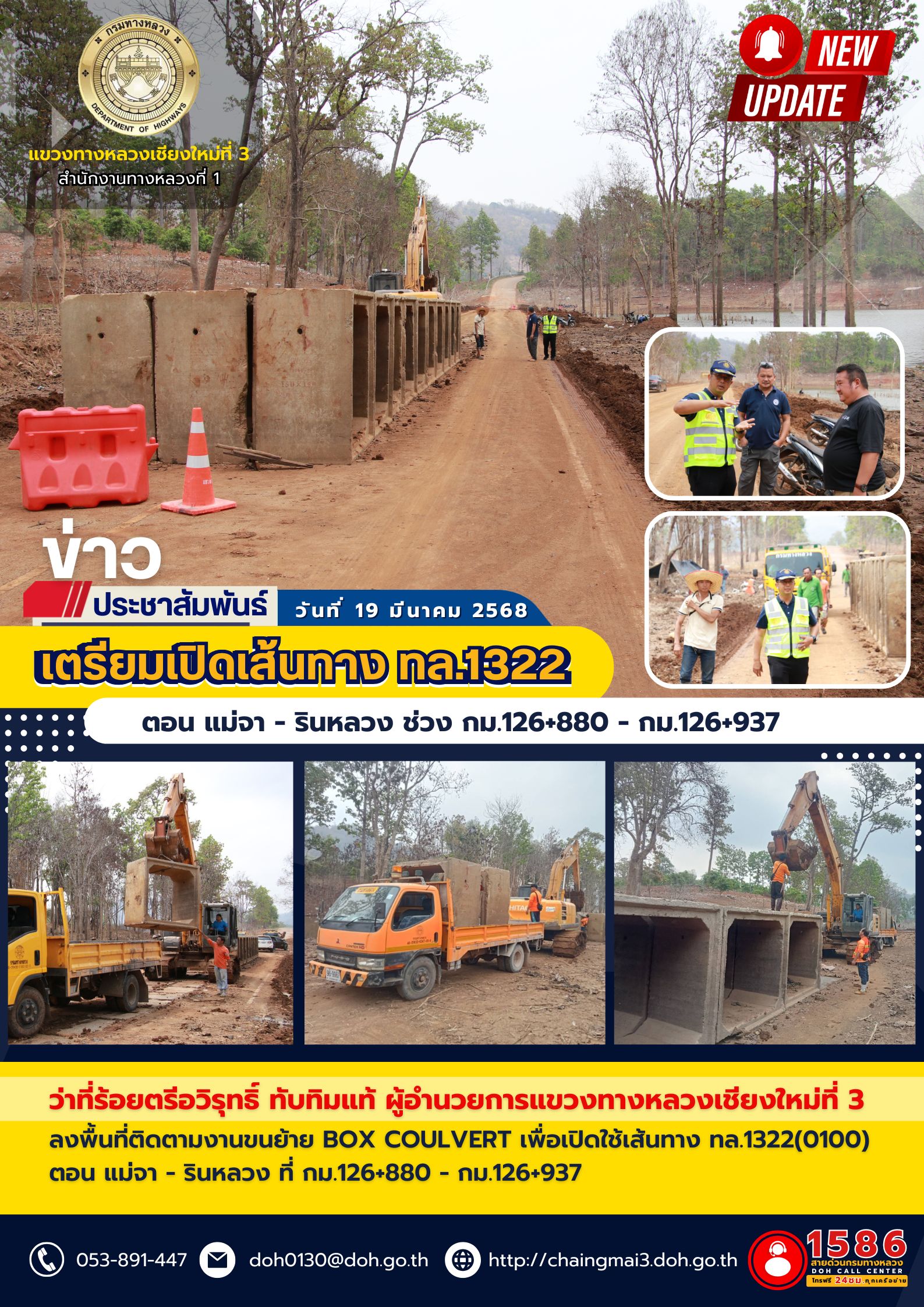 19 มีนาคม 2568 กรมทางหลวง โดยหมวดทางหลวงเวียงแหง แขวงทางหลวงเชียงใหม่ที่ 3 สำนักงานทางหลวงที่ 1 ขอแจ้งประชาสัมพันธ์ เปิดการจราจรบนทางหลวงหมายเลข 1322 ตอน แม่จา - รินหลวง ช่วง กม.126+900 - กม.127+050 ตำบลเมืองนะ อำเภอเชียงดาว จังหวัดเชียงใหม่ เนื่องจากเกิดเหตุอุทกภัย ซึ่งมีน้ำท่วมขังต้้งแต่วันที่ 4 ตุลาคม 2567 ทำให้ไม่สามารถสัญจรได้โดยระดับน้ำสูงสุดเมื่อ วันที่ 12 ธันวาคม 2567 วัดได้ 724 เซนติเมตร จากลักษณะพื้นที่ลุ่มต่ำ มีลักษณะเป็นตาน้ำผุด และมีอ่างเก็บน้ำตั้งอยู่ใกล้เคียง ซึ่งมีระดับสูงกว่าพื้นผิวจราจร ประกอบกับพื้นที่ดังกล่าวมีลักษณะคล้ายทะเลสาบขนาดย่อม เป็นปรากฏการณ์ตามธรรมชาติ