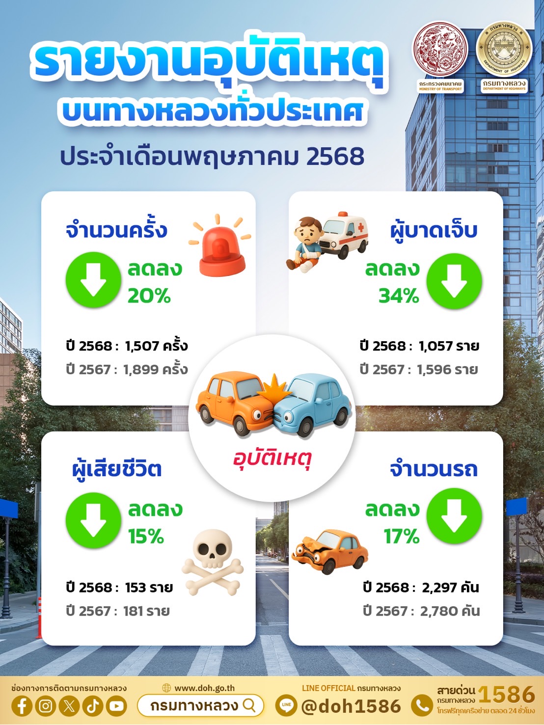 กรมทางหลวง โดยสำนักอำนวยความปลอดภัย ได้สรุปรายงานข้อมูลอุบัติเหตุบนทางหลวงทั่วประเทศประจำเดือนพฤษภาคม 2568 จากการรายงานอุบัติเหตุทางระบบ HAIMS