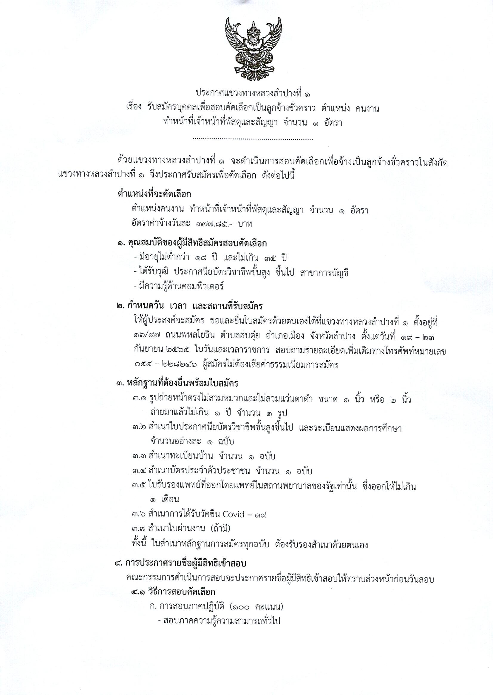 143 19/09/2565 ประกาศแขวงทางหลวงลำปางที่ 1 รับสมัครบุคคลเพื่อสอบคัดเลือกเป็นลูกจ้างชั่วคราว ตำแหน่ง คนงาน ทำหน้าที่เจ้าหน้าที่พัสดุและสัญญา
