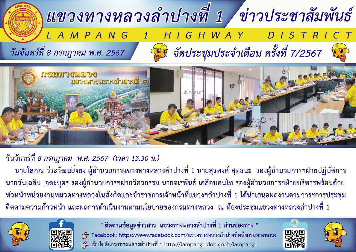 63 10/07/2567 ติดตามความก้าวหน้าและผลการดำเนินงานตามนโยบายของกรมทางหลวง
