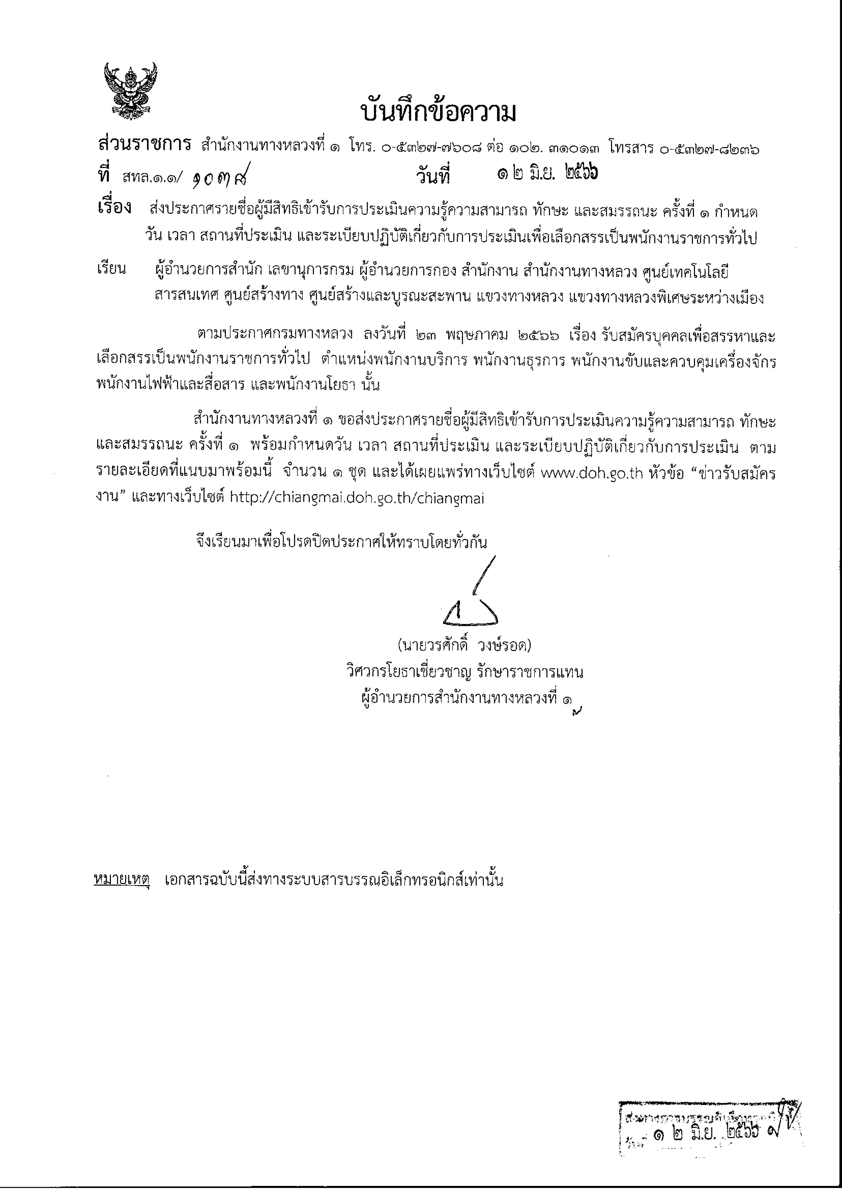 ประกาศกรมทางหลวง เรื่อง รายชื่อผู้ผ่านการประเมินความรู้ความสามารถ ทักษะ และสมรรถนะ ครั้งที่ 1 และมีสิทธิเข้ารับการประเมินความรู้ ความสามารถ ทักษะ และสมรรถนะ ครั้งที่ 2 พร้อมกำหนดวัน เวลา และสถานที่สอบ ในตำแหน่ง พนักงานบริการ พนักงานธุรการ พนักงานขับและควบคุมเครื่องจักร พนักงานไฟฟ้าและสื่อสารและพนักงานโยธา