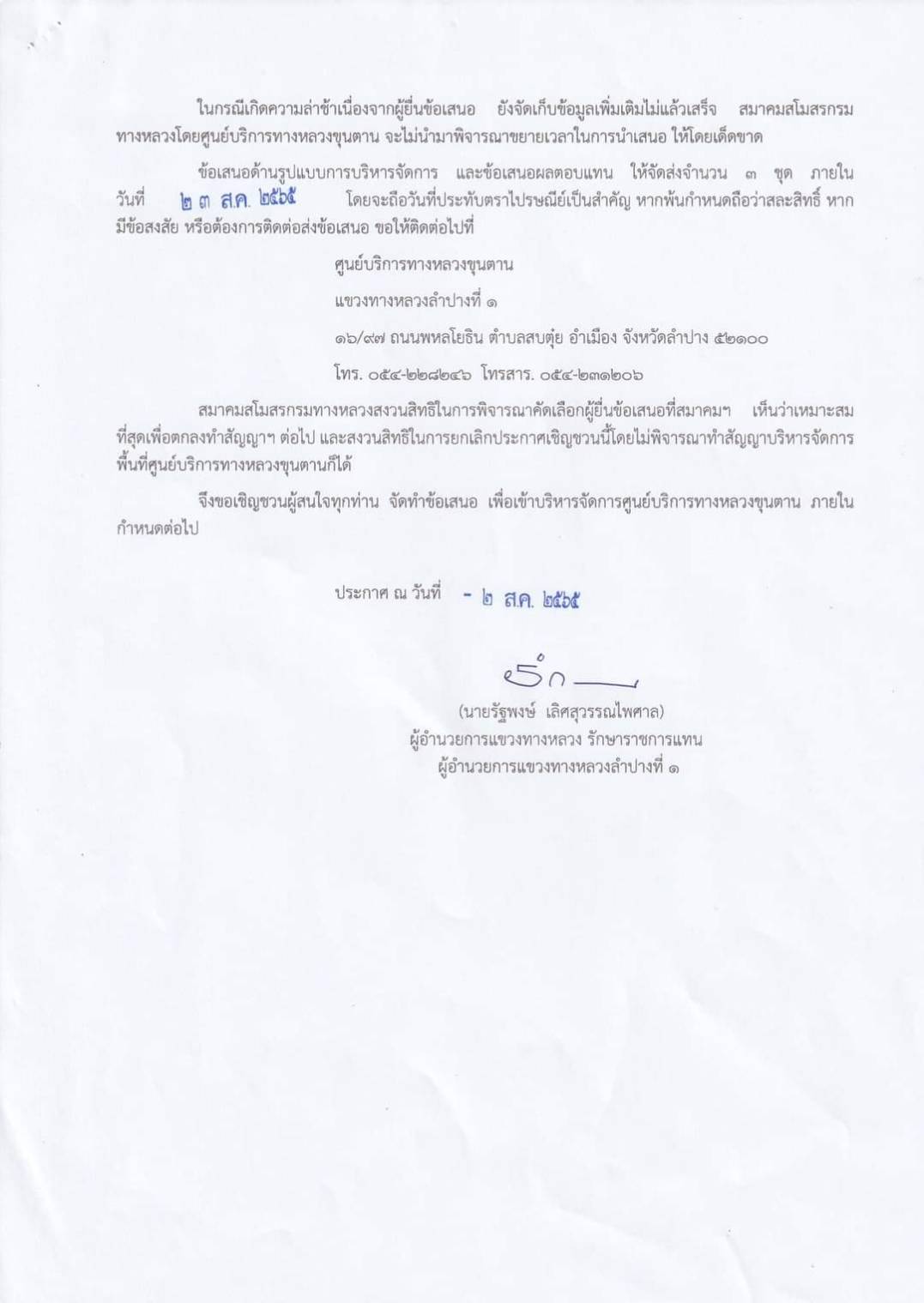ศูนย์บริการทางหลวงขุนตาน แขวงทางหลวงลำปางที่ 1 ประกาศเชิญชวนผู้ที่มีความสนใจยื่นข้อเสนอเข้ามาบริหารจัดการศูนย์บริการทางหลวงขุนตาน จังหวัดลำปาง